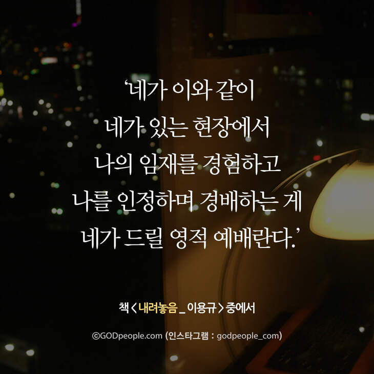 그때 내가 처한 현장에서 하나님이 원하시는 모습으로, 그분이 내가 하는 일의 주인이심을 고백하고 인정하는 게 그분이 가장 기뻐하시는 예배임을 재확인했다.
