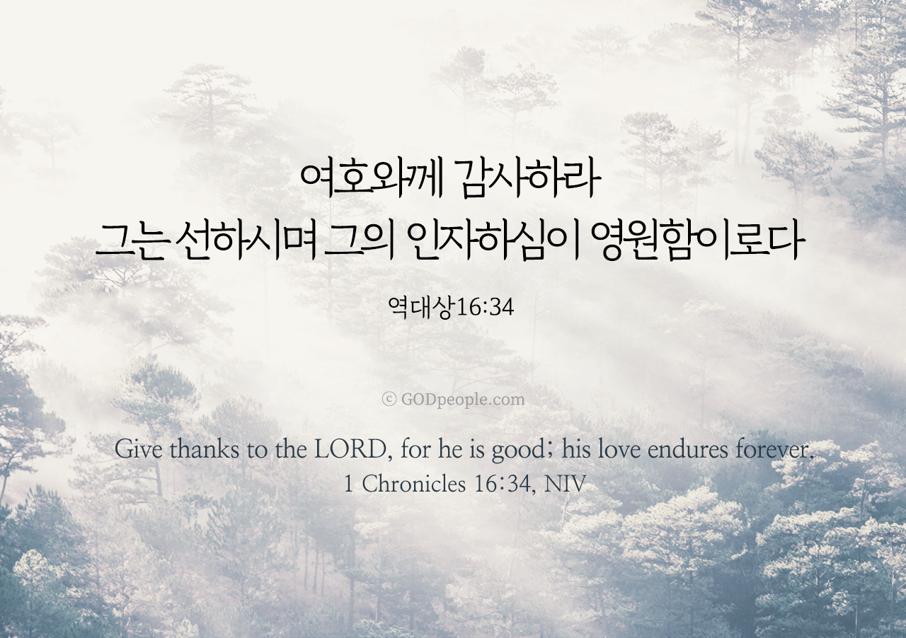 여호와께 감사하라 그는 선하시며 그의 인자하심이 영원함이로다 _역대상 16:34Give thanks to the LORD, for he is good; his love endures forever. _1 Chronicles 16:34, NIV ♥ 교도소 재소자에게 성경책을 보내드립니다. [플로잉전용상품] 재소자에게 성경책 보내기_우리말성경 단본(실버그린)우리말성경 단본 (무색인/무지퍼/페이퍼백/실버그린/DKV2406)두란노 편집부 [플로잉전용상품] 재소자에게 성경책 보내기_큰글로 읽는 우리말 비전성경 중단본(호박색)큰글로 읽는 우리말 비전성경 중단본(색인/무지퍼/PU/호박색/DKV2206)도서출판 두란노두란노 편집부 위 성경책을 구매 (플로잉 Flowing) 하시면 "프리즌 리바이벌 PRISON REVIVAL "을 통해서 국내 교정기관의 담장 안에서 지내시는 분들에게 전달됩니다.♥ 수용자 자녀에게 성경만화, 묵상365를 보내드립니다. [플로잉전용상품] 수용자 자녀에게 성경만화 보내기_만화 예수님의 생애 세트 (전3권)온 가족이 함께 보는 사복음서김동순 [플로잉전용상품] 수용자 자녀에게 성경만화 보내기_[개역개정판] 카툰성경 세트(완간/전3권)그린이 : 키이스 닐리, 데이비드 마일즈 [플로잉전용상품] 갓피플 통해 쌀 보내기_백미 (10kg)오픈스토리 [플로잉전용상품] 맛있는 반찬보내기_김치세트 (유기농백김치+겉절이)참식품주식회사 위 상품 구매 (플로잉 Flowing) 하시면 "세움"을 통해서 수용자(교도소 재소자) 자녀들에게 전달됩니다.+오늘의말씀으로 만들었어요♡ 오늘의말씀 아크릴 자석액자+말씀을 듣고 필사하세요♡ 개역개정 MP3 다운로드 | 태블릿으로 필사 | 종이노트로 필사 좋아요아멘개척교회 돕기 2025-05-13 · 3878 · 304 · 1오늘의말씀 말씀카드 역대상16장34절 전도오늘의말씀더보기갓피플 오늘의말씀_에스겔36장36절갓피플 오늘의말씀_갈라디아서4장18절갓피플 오늘의말씀_누가복음6장23절