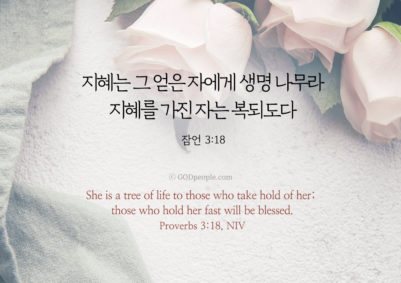 지혜는 그 얻은 자에게 생명 나무라 지혜를 가진 자는 복되도다 _잠언 3:18She is a tree of life to those who take hold of her; those who hold her fast will be blessed. _Proverbs 3:18, NIV ♥ 교도소 재소자에게 성경책을 보내드립니다. [플로잉전용상품] 재소자에게 성경책 보내기_우리말성경 단본(실버그린)우리말성경 단본 (무색인/무지퍼/페이퍼백/실버그린/DKV2406)두란노 편집부 [플로잉전용상품] 재소자에게 성경책 보내기_큰글로 읽는 우리말 비전성경 중단본(호박색)큰글로 읽는 우리말 비전성경 중단본(색인/무지퍼/PU/호박색/DKV2206)도서출판 두란노두란노 편집부 위 성경책을 구매 (플로잉 Flowing) 하시면 "프리즌 리바이벌 PRISON REVIVAL "을 통해서 국내 교정기관의 담장 안에서 지내시는 분들에게 전달됩니다.♥ 수용자 자녀에게 성경만화, 묵상365를 보내드립니다. [플로잉전용상품] 수용자 자녀에게 성경만화 보내기_만화 예수님의 생애 세트 (전3권)온 가족이 함께 보는 사복음서김동순 [플로잉전용상품] 수용자 자녀에게 성경만화 보내기_[개역개정판] 카툰성경 세트(완간/전3권)그린이 : 키이스 닐리, 데이비드 마일즈 [플로잉전용상품] 갓피플 통해 쌀 보내기_백미 (10kg)오픈스토리 [플로잉전용상품] 맛있는 반찬보내기_김치세트 (유기농백김치+겉절이)참식품주식회사 위 상품 구매 (플로잉 Flowing) 하시면 "세움"을 통해서 수용자(교도소 재소자) 자녀들에게 전달됩니다.+오늘의말씀으로 만들었어요♡ 오늘의말씀 아크릴 자석액자+말씀을 듣고 필사하세요♡ 개역개정 MP3 다운로드 | 태블릿으로 필사 | 종이노트로 필사 좋아요아멘개척교회 돕기 2025-05-14 · 5842 · 541 · 오늘의말씀 말씀카드 잠언3장18절 전도오늘의말씀더보기갓피플 오늘의말씀_마가복음1장11절_2018.6.28갓피플 오늘의말씀_요한복음20장22절_2018.6.26갓피플 오늘의말씀_마가복음1장17절_2018.6.29