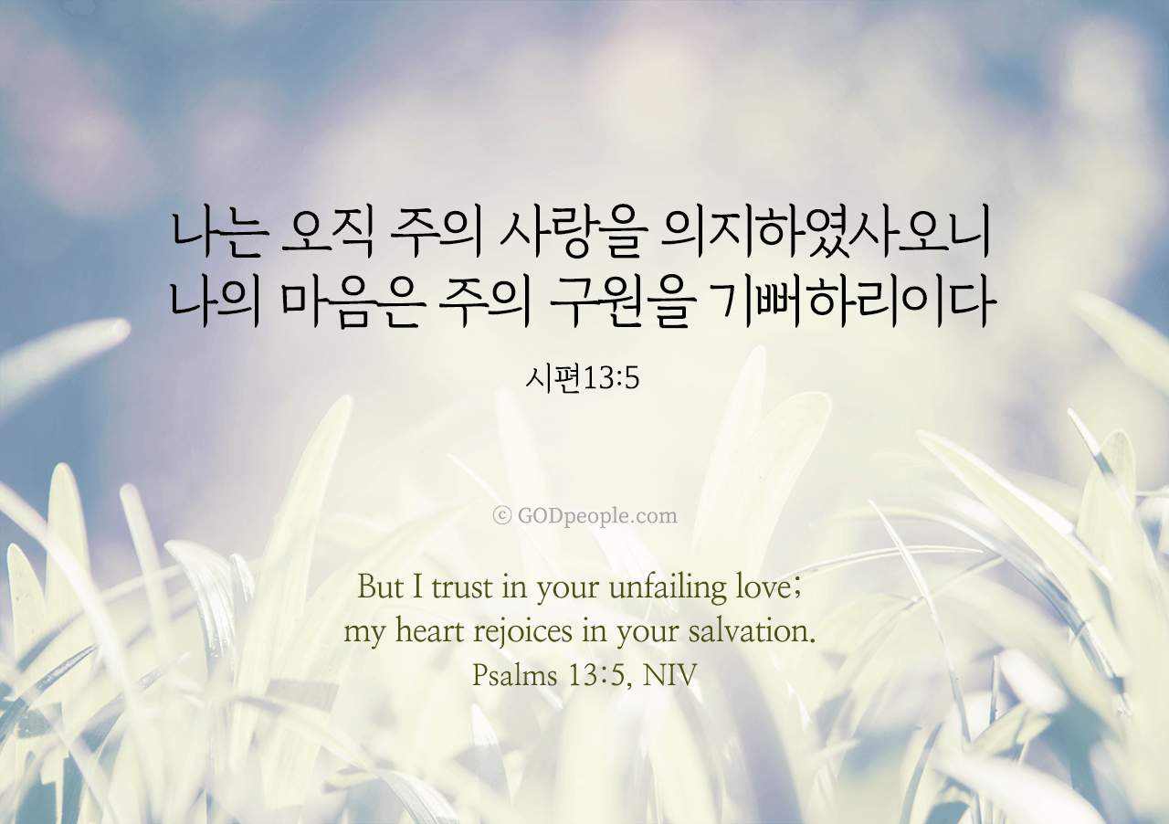 나는 오직 주의 사랑을 의지하였사오니 나의 마음은 주의 구원을 기뻐하리이다 _시편 13:5But I trust in your unfailing love; my heart rejoices in your salvation. _Psalms 13:5, NIV ♥ 교도소 재소자에게 성경책을 보내드립니다. [플로잉전용상품] 재소자에게 성경책 보내기_우리말성경 단본(실버그린)우리말성경 단본 (무색인/무지퍼/페이퍼백/실버그린/DKV2406)두란노 편집부 [플로잉전용상품] 재소자에게 성경책 보내기_큰글로 읽는 우리말 비전성경 중단본(호박색)큰글로 읽는 우리말 비전성경 중단본(색인/무지퍼/PU/호박색/DKV2206)도서출판 두란노두란노 편집부 위 성경책을 구매 (플로잉 Flowing) 하시면 "프리즌 리바이벌 PRISON REVIVAL "을 통해서 국내 교정기관의 담장 안에서 지내시는 분들에게 전달됩니다.♥ 수용자 자녀에게 성경만화, 묵상365를 보내드립니다. [플로잉전용상품] 수용자 자녀에게 성경만화 보내기_만화 예수님의 생애 세트 (전3권)온 가족이 함께 보는 사복음서김동순 [플로잉전용상품] 수용자 자녀에게 성경만화 보내기_[개역개정판] 카툰성경 세트(완간/전3권)그린이 : 키이스 닐리, 데이비드 마일즈 [플로잉전용상품] 갓피플 통해 쌀 보내기_백미 (10kg)오픈스토리 [플로잉전용상품] 맛있는 반찬보내기_김치세트 (유기농백김치+겉절이)참식품주식회사 위 상품 구매 (플로잉 Flowing) 하시면 "세움"을 통해서 수용자(교도소 재소자) 자녀들에게 전달됩니다.+오늘의말씀으로 만들었어요♡ 오늘의말씀 아크릴 자석액자+말씀을 듣고 필사하세요♡ 개역개정 MP3 다운로드 | 태블릿으로 필사 | 종이노트로 필사 좋아요아멘개척교회 돕기 2025-06-06 · 2691 · 224 · 1오늘의말씀 말씀카드 시편13편5절 전도오늘의말씀더보기갓피플 오늘의말씀_에스겔36장36절갓피플 오늘의말씀_갈라디아서4장18절갓피플 오늘의말씀_누가복음6장23절