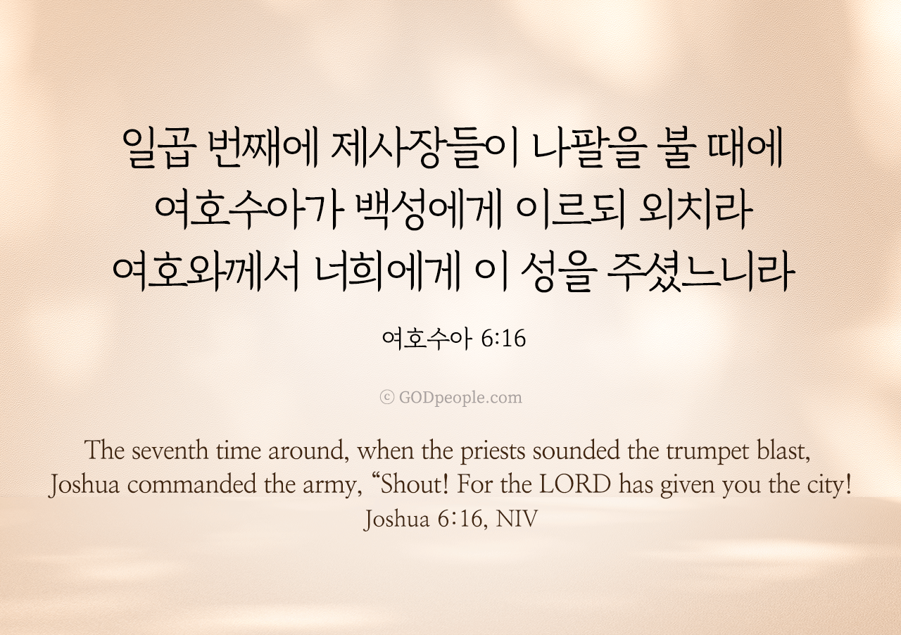 일곱 번째에 제사장들이 나팔을 불 때에 여호수아가 백성에게 이르되 외치라 여호와께서 너희에게 이 성을 주셨느니라 _여호수아 6:16The seventh time around, when the priests sounded the trumpet blast, Joshua commanded the army, "Shout! For the LORD has given you the city! _Joshua 6:16, NIV ♥ 교도소 재소자에게 성경책을 보내드립니다. [플로잉전용상품] 재소자에게 성경책 보내기_우리말성경 단본(실버그린)우리말성경 단본 (무색인/무지퍼/페이퍼백/실버그린/DKV2406)두란노 편집부 [플로잉전용상품] 재소자에게 성경책 보내기_큰글로 읽는 우리말 비전성경 중단본(호박색)큰글로 읽는 우리말 비전성경 중단본(색인/무지퍼/PU/호박색/DKV2206)도서출판 두란노두란노 편집부 위 성경책을 구매 (플로잉 Flowing) 하시면 "프리즌 리바이벌 PRISON REVIVAL "을 통해서 국내 교정기관의 담장 안에서 지내시는 분들에게 전달됩니다.♥ 수용자 자녀에게 성경만화, 묵상365를 보내드립니다. [플로잉전용상품] 수용자 자녀에게 성경만화 보내기_만화 예수님의 생애 세트 (전3권)온 가족이 함께 보는 사복음서김동순 [플로잉전용상품] 수용자 자녀에게 성경만화 보내기_[개역개정판] 카툰성경 세트(완간/전3권)그린이 : 키이스 닐리, 데이비드 마일즈 [플로잉전용상품] 갓피플 통해 쌀 보내기_백미 (10kg)오픈스토리 [플로잉전용상품] 맛있는 반찬보내기_김치세트 (유기농백김치+겉절이)참식품주식회사 위 상품 구매 (플로잉 Flowing) 하시면 "세움"을 통해서 수용자(교도소 재소자) 자녀들에게 전달됩니다.+오늘의말씀으로 만들었어요♡ 오늘의말씀 아크릴 자석액자+말씀을 듣고 필사하세요♡ 개역개정 MP3 다운로드 | 태블릿으로 필사 | 종이노트로 필사 좋아요아멘개척교회 돕기 2025-06-07 · 2304 · 177 · 2오늘의말씀 말씀카드 여호수아6장16절 전도오늘의말씀더보기갓피플 오늘의말씀_시편33편11절_2021.11.13갓피플 오늘의말씀_시편34편7절_2021.11.16갓피플 오늘의말씀_요한복음15장4절_2021.11.15