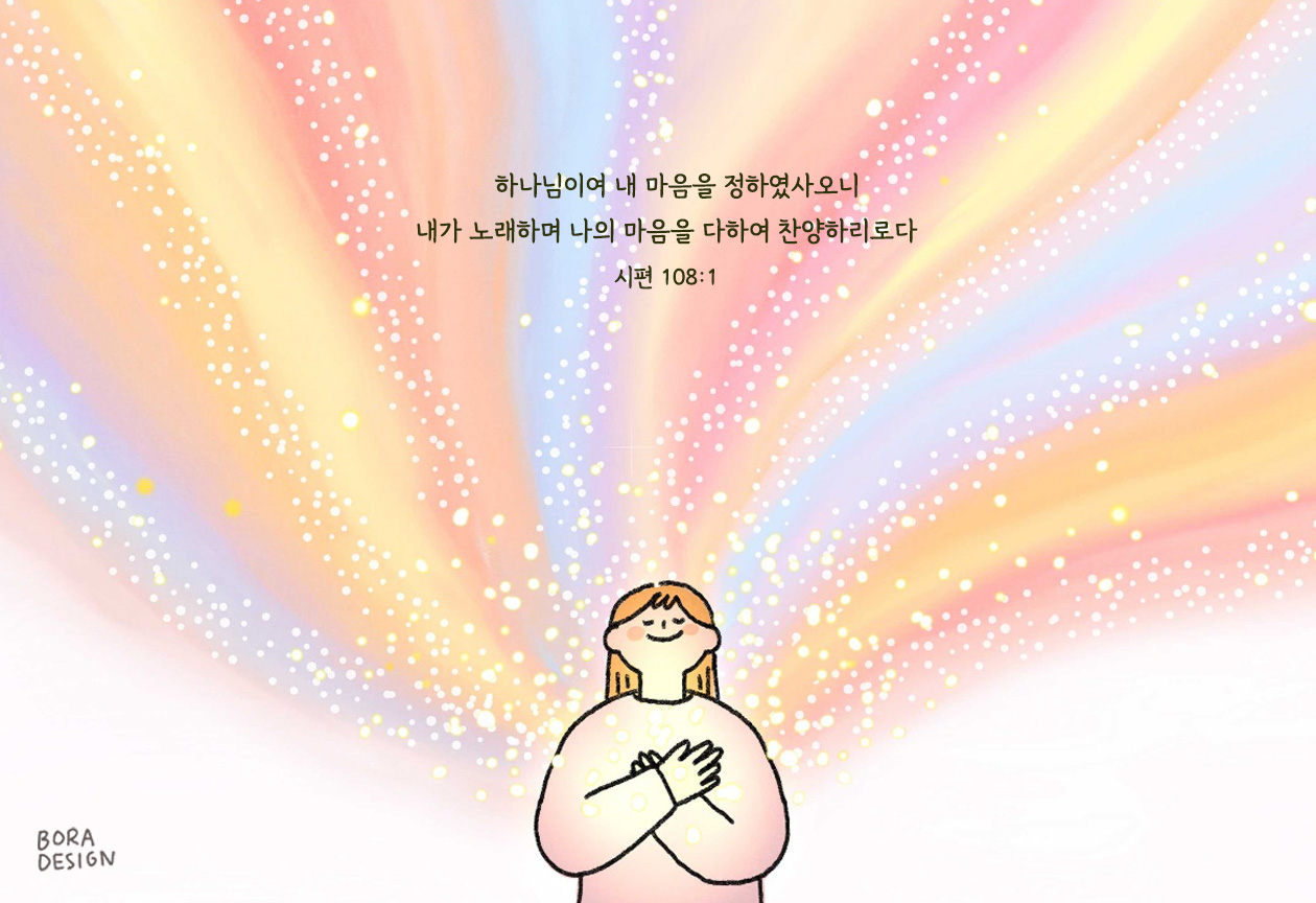 하나님이여 내 마음을 정하였사오니 내가 노래하며 나의 마음을 다하여 찬양하리로다 _시편 108: 1 이보라 작가 작품활동 응원하기!지난 20년간 갓피플 만화는 주보 사용을 무료로 제공해왔습니다. 이제는 작가들에게 작은 정성을 표현하면 어떨까요? 주보 1회 사용시 1,000원의 자발적 결제 후 이용해주세요주보사용 자발적 결제1,000원작가에게 커피 한잔선물하기좋아요아멘개척교회 돕기 2025-07-24 · 2716 · 23 · 4기도주보만화갓피플만화감사그림묵상찬양좋은성경구절시편순종Every moment diary_이보라더보기아버지께서 찾으시는 예배자나를 버리지 않으시고나의 마음을 다하여