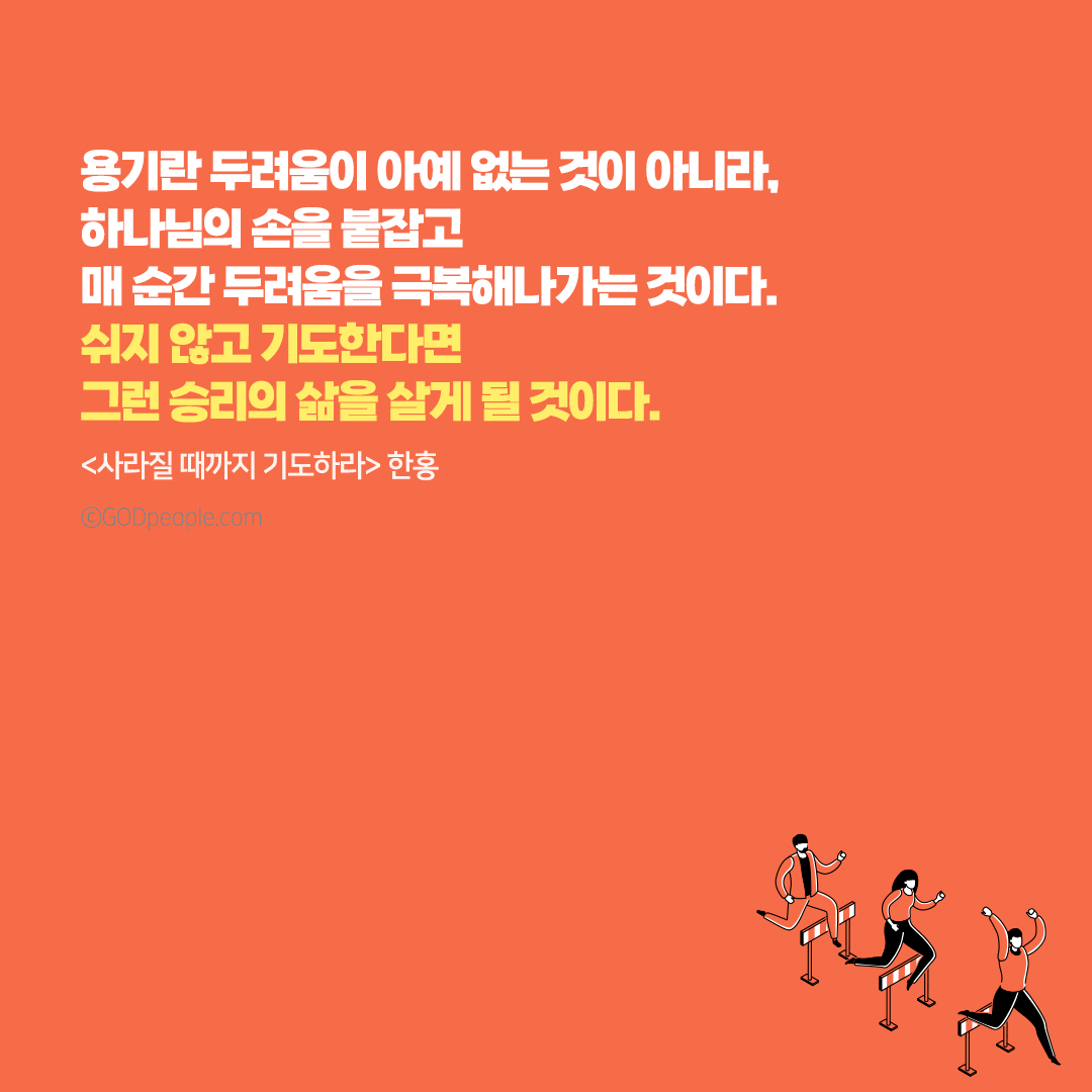 용기란 두려움이 아예 없는 것이 아니라, 하나님의 손을 붙잡고 매 순간 두려움을 극복해나가는 것이다.