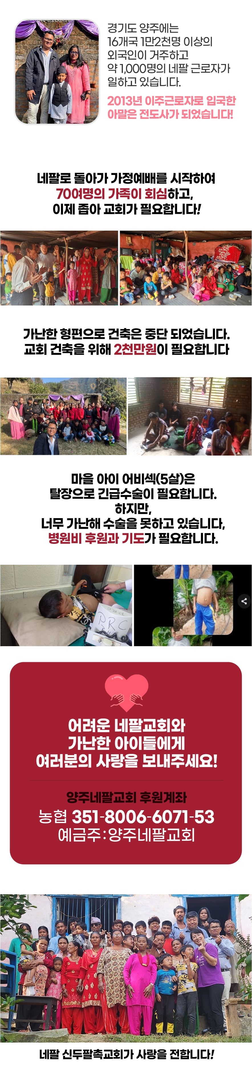양주네팔교회는, 한국에 이주하여 근로하는 네팔인과 이주민을(유학생, 결혼이주자) 선교하는 교회 입니다. 1명의 네팔인이 예수님을 믿고, 진실한 그리스도인이 된다면 네팔에 돌아가 가족, 이웃, 민족에게 복음을 전할 수 있습니다. 양주네팔교회는 네팔 현지교회와 연계하여 네팔로 돌아간 근로자와 가족들, 네팔현지 선교사역들과 꾸준히 방문, 동역하고 있습니다.