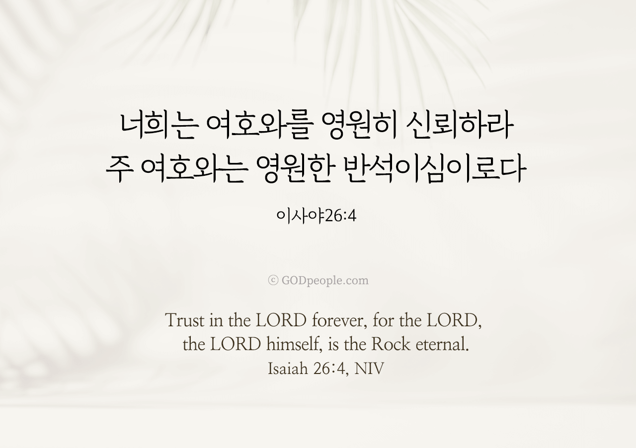 너희는 여호와를 영원히 신뢰하라 주 여호와는 영원한 반석이심이로다 _이사야 26:4Trust in the LORD forever, for the LORD, the LORD himself, is the Rock eternal. _Isaiah 26:4, NIV ♥ 교도소 재소자에게 성경책을 보내드립니다. [플로잉전용상품] 재소자에게 성경책 보내기_우리말성경 단본(실버그린)우리말성경 단본 (무색인/무지퍼/페이퍼백/실버그린/DKV2406)두란노 편집부 [플로잉전용상품] 재소자에게 성경책 보내기_큰글로 읽는 우리말 비전성경 중단본(호박색)큰글로 읽는 우리말 비전성경 중단본(색인/무지퍼/PU/호박색/DKV2206)도서출판 두란노두란노 편집부 위 성경책을 구매 (플로잉 Flowing) 하시면 "프리즌 리바이벌 PRISON REVIVAL "을 통해서 국내 교정기관의 담장 안에서 지내시는 분들에게 전달됩니다.♥ 수용자 자녀에게 성경만화, 묵상365를 보내드립니다. [플로잉전용상품] 수용자 자녀에게 성경만화 보내기_만화 예수님의 생애 세트 (전3권)온 가족이 함께 보는 사복음서김동순 [플로잉전용상품] 수용자 자녀에게 성경만화 보내기_[개역개정판] 카툰성경 세트(완간/전3권)그린이 : 키이스 닐리, 데이비드 마일즈 [플로잉전용상품] 갓피플 통해 쌀 보내기_백미 (10kg)오픈스토리 [플로잉전용상품] 맛있는 반찬보내기_김치세트 (유기농백김치+겉절이)참식품주식회사 위 상품 구매 (플로잉 Flowing) 하시면 "세움"을 통해서 수용자(교도소 재소자) 자녀들에게 전달됩니다.+오늘의말씀으로 만들었어요♡ 오늘의말씀 아크릴 자석액자+말씀을 듣고 필사하세요♡ 개역개정 MP3 다운로드 | 태블릿으로 필사 | 종이노트로 필사 좋아요아멘개척교회 돕기 2025-08-13 · 5816 · 250 · 오늘의말씀 말씀카드 이사야26장4절 전도오늘의말씀더보기갓피플 오늘의말씀_에스겔36장36절갓피플 오늘의말씀_갈라디아서4장18절갓피플 오늘의말씀_누가복음6장23절