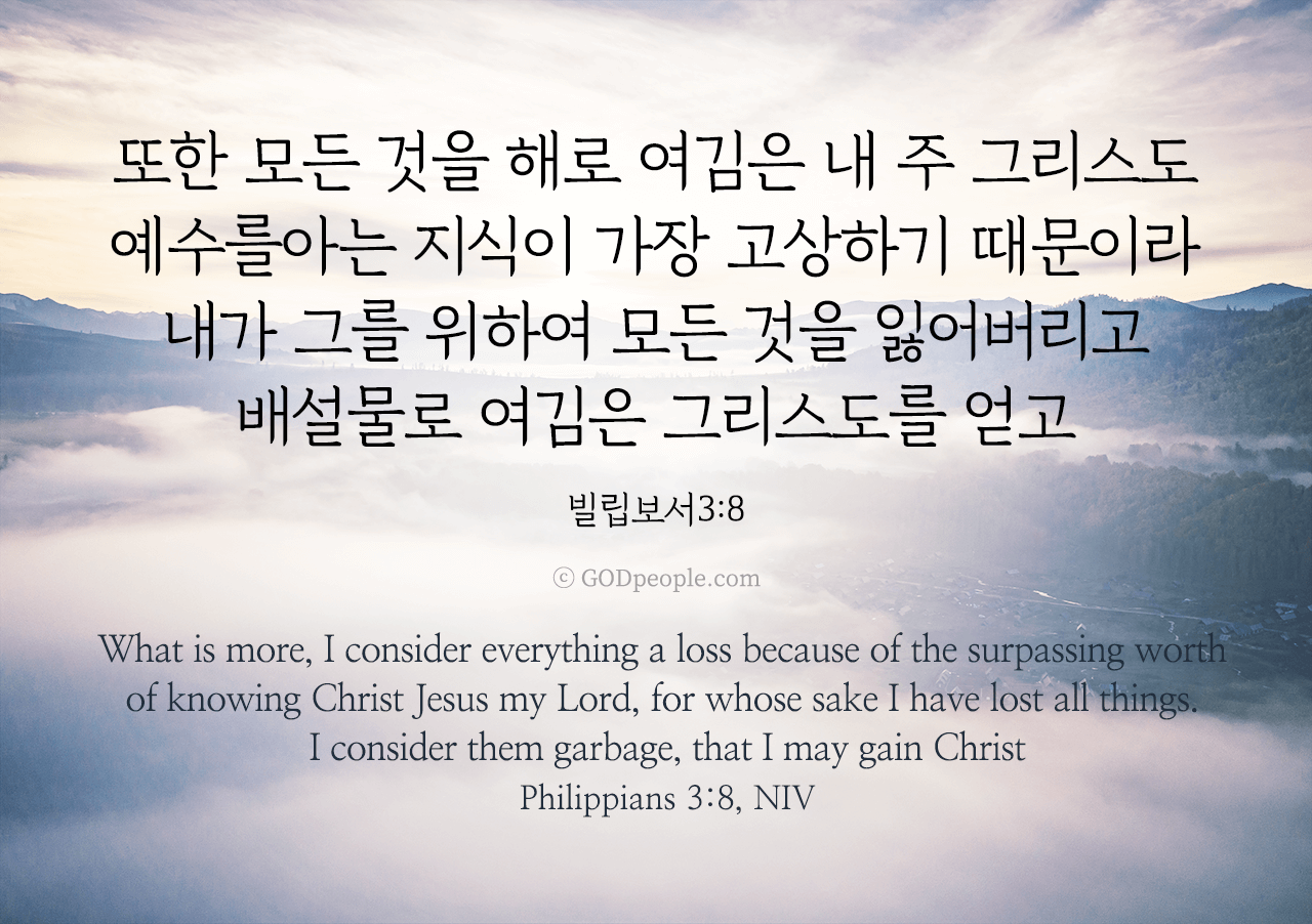 또한 모든 것을 해로 여김은 내 주 그리스도 예수를 아는 지식이 가장 고상하기 때문이라 내가 그를 위하여 모든 것을 잃어버리고 배설물로 여김은 그리스도를 얻고 _빌립보서 3:8![]()