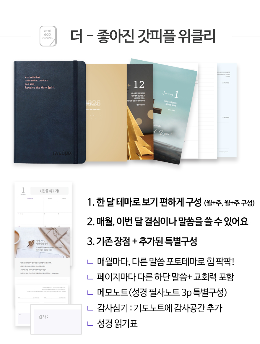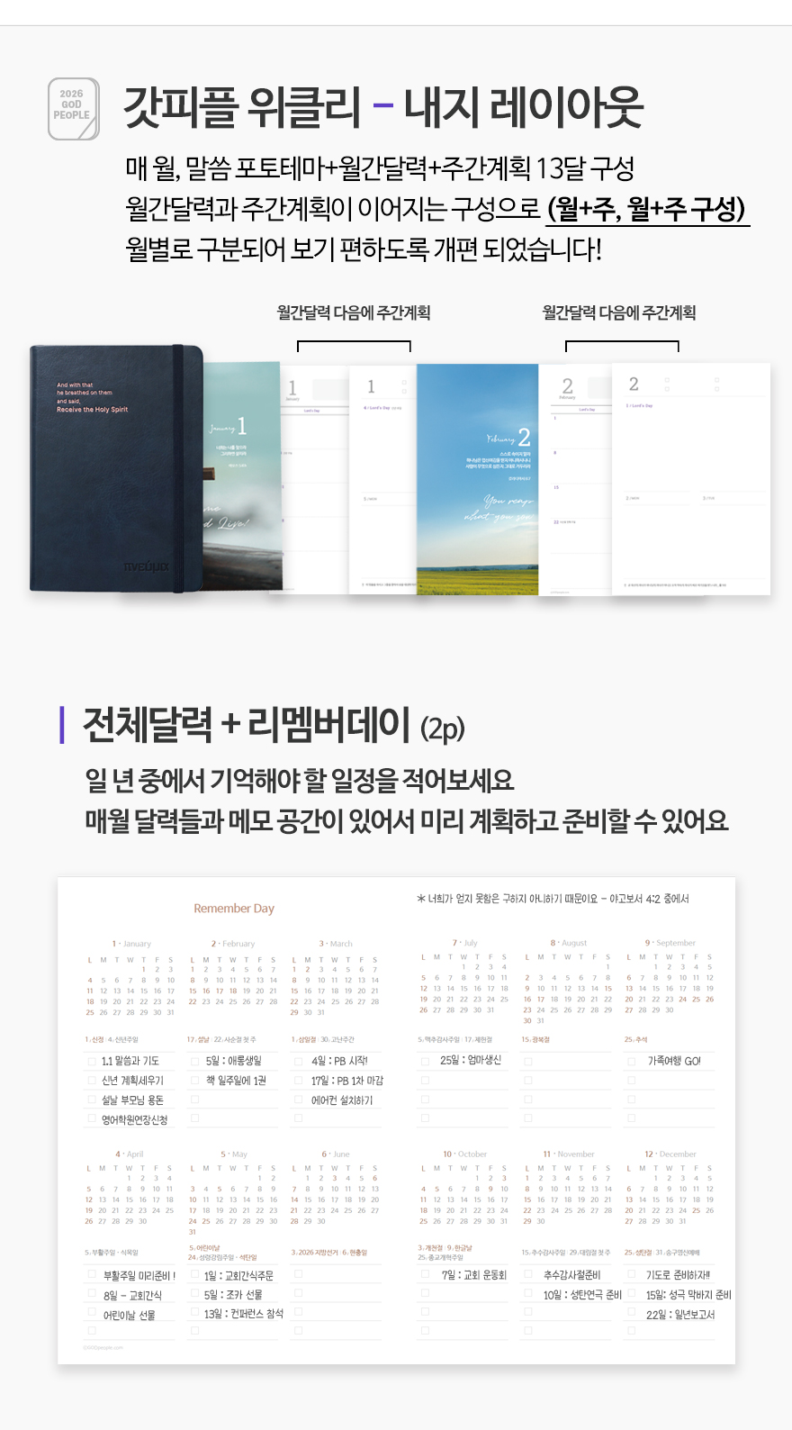 · 구성 : 13달 월간 + 주간일정 + 노트 + 기도노트 (매 달마다 포토 말씀테마)