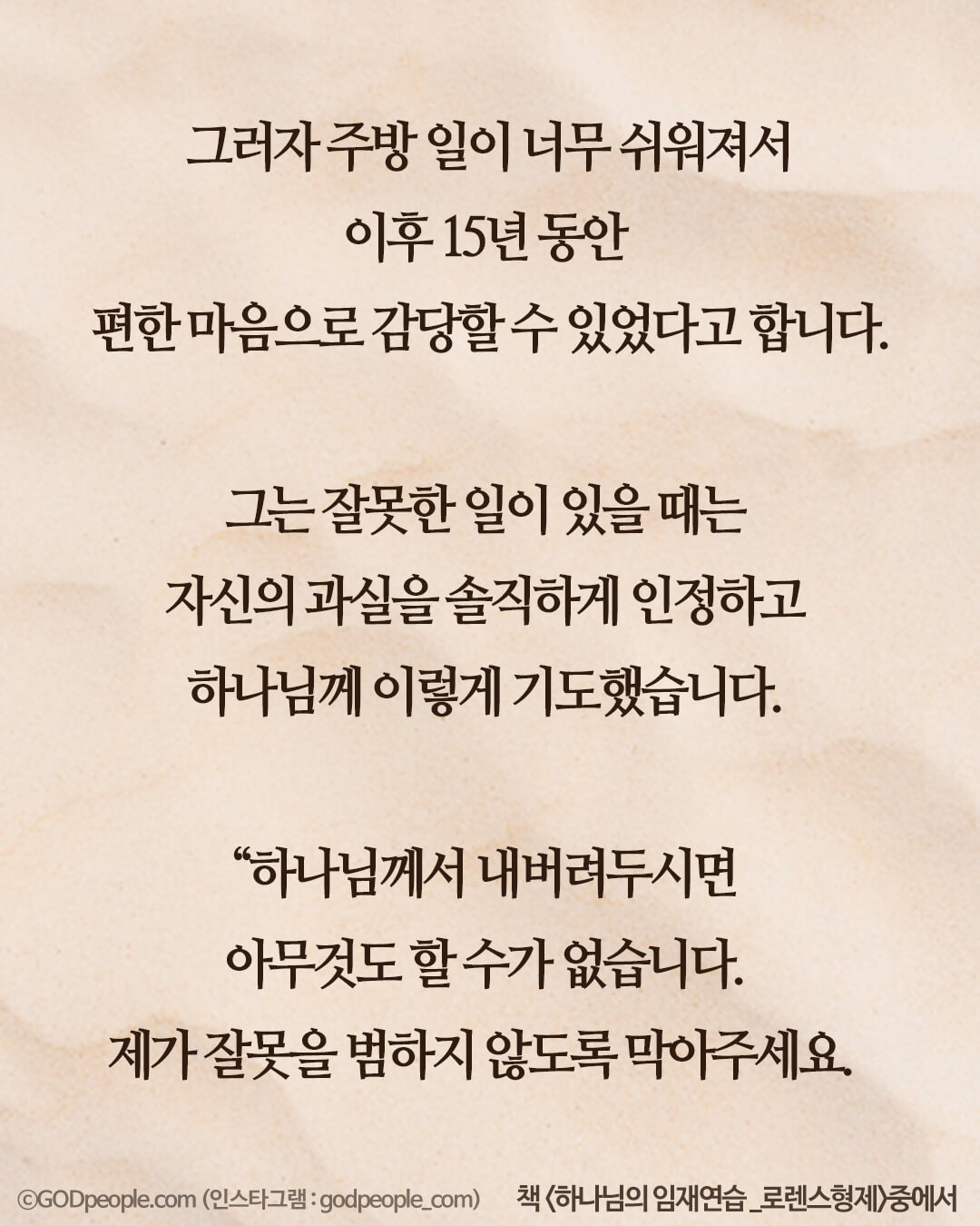 그는 접시를 닦고 음식을 만들면서 하나님의 임재를 연습했다.