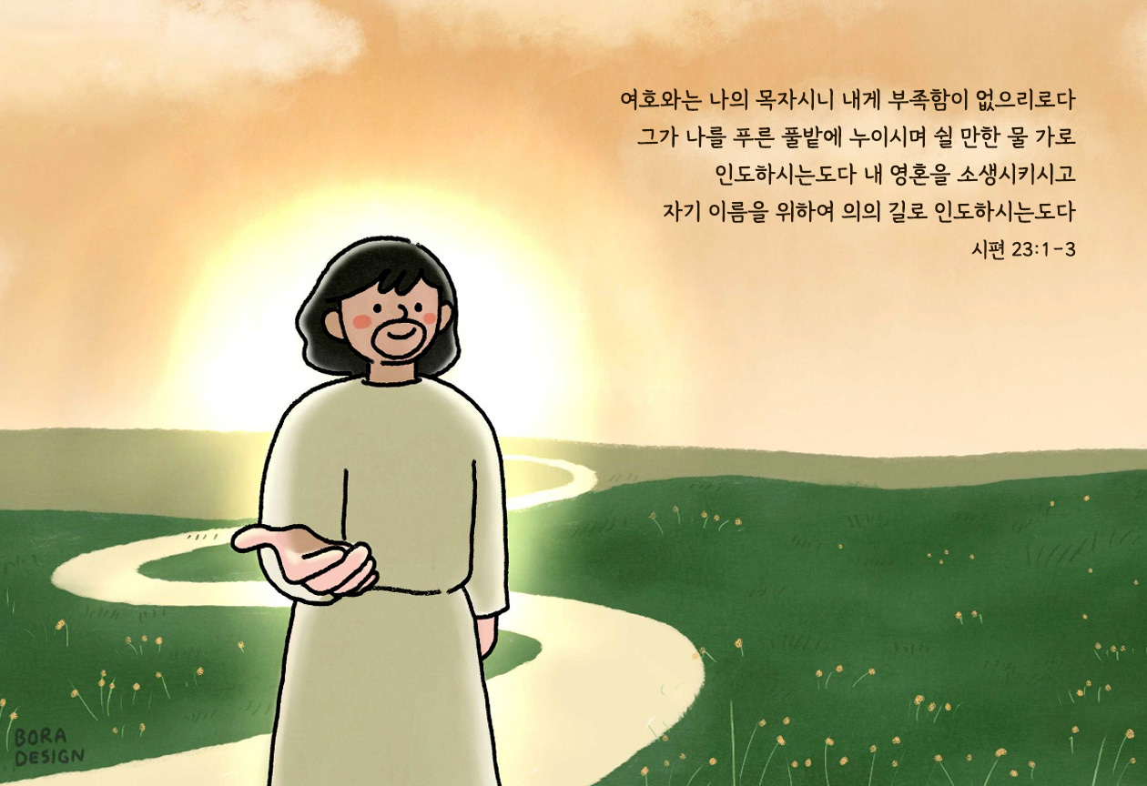 여호와는 나의 목자시니 내게 부족함이 없으리로다 그가 나를 푸른 풀밭에 누이시며 쉴 만한 물 가로 인도하시는도다 내 영혼을 소생시키시고 자기 이름을 위하여 의의 길로 인도하시는도다 _시편 23: 1~3 이보라 작가 작품활동 응원하기!지난 20년간 갓피플 만화는 주보 사용을 무료로 제공해왔습니다. 이제는 작가들에게 작은 정성을 표현하면 어떨까요? 주보 1회 사용시 1,000원의 자발적 결제 후 이용해주세요주보사용 자발적 결제1,000원작가에게 커피 한잔선물하기좋아요아멘개척교회 돕기 2025-12-11 · 754 · 15 · 4시편말씀카드예수님은혜위로구원소망묵상그림묵상주보만화갓피플만화회복좋은성경구절Every moment diary_이보라더보기아버지께서 찾으시는 예배자나를 버리지 않으시고나의 마음을 다하여