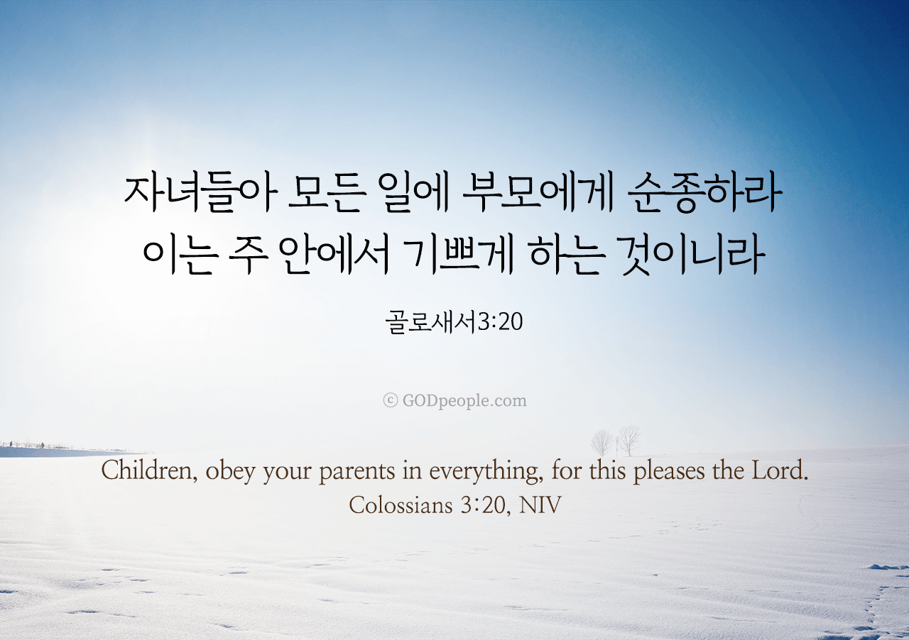 자녀들아 모든 일에 부모에게 순종하라 이는 주 안에서 기쁘게 하는 것이니라 _골로새서 3:20Children, obey your parents in everything, for this pleases the Lord. _Colossians 3:20, NIV ♥ 교도소 재소자에게 성경책을 보내드립니다. [플로잉전용상품] 재소자에게 성경책 보내기_우리말성경 단본(실버그린)우리말성경 단본 (무색인/무지퍼/페이퍼백/실버그린/DKV2406)두란노 편집부 [플로잉전용상품] 재소자에게 성경책 보내기_큰글로 읽는 우리말 비전성경 중단본(호박색)큰글로 읽는 우리말 비전성경 중단본(색인/무지퍼/PU/호박색/DKV2206)도서출판 두란노두란노 편집부 위 성경책을 구매 (플로잉 Flowing) 하시면 "프리즌 리바이벌 PRISON REVIVAL "을 통해서 국내 교정기관의 담장 안에서 지내시는 분들에게 전달됩니다.♥ 수용자 자녀에게 성경만화, 묵상365를 보내드립니다. [플로잉전용상품] 수용자 자녀에게 성경만화 보내기_만화 예수님의 생애 세트 (전3권)온 가족이 함께 보는 사복음서김동순 [플로잉전용상품] 수용자 자녀에게 성경만화 보내기_[개역개정판] 카툰성경 세트(완간/전3권)그린이 : 키이스 닐리, 데이비드 마일즈 [플로잉전용상품] 갓피플 통해 쌀 보내기_백미 (10kg)오픈스토리 [플로잉전용상품] 맛있는 반찬보내기_김치세트 (유기농백김치+겉절이)참식품주식회사 위 상품 구매 (플로잉 Flowing) 하시면 "세움"을 통해서 수용자(교도소 재소자) 자녀들에게 전달됩니다.+오늘의말씀으로 만들었어요♡ 오늘의말씀 아크릴 자석액자+말씀을 듣고 필사하세요♡ 개역개정 MP3 다운로드 | 태블릿으로 필사 | 종이노트로 필사 좋아요아멘개척교회 돕기 2025-12-15 · 2483 · 203 · 오늘의말씀 말씀카드 골로새서3장20절 전도오늘의말씀더보기갓피플 오늘의말씀_에스겔36장36절갓피플 오늘의말씀_갈라디아서4장18절갓피플 오늘의말씀_누가복음6장23절