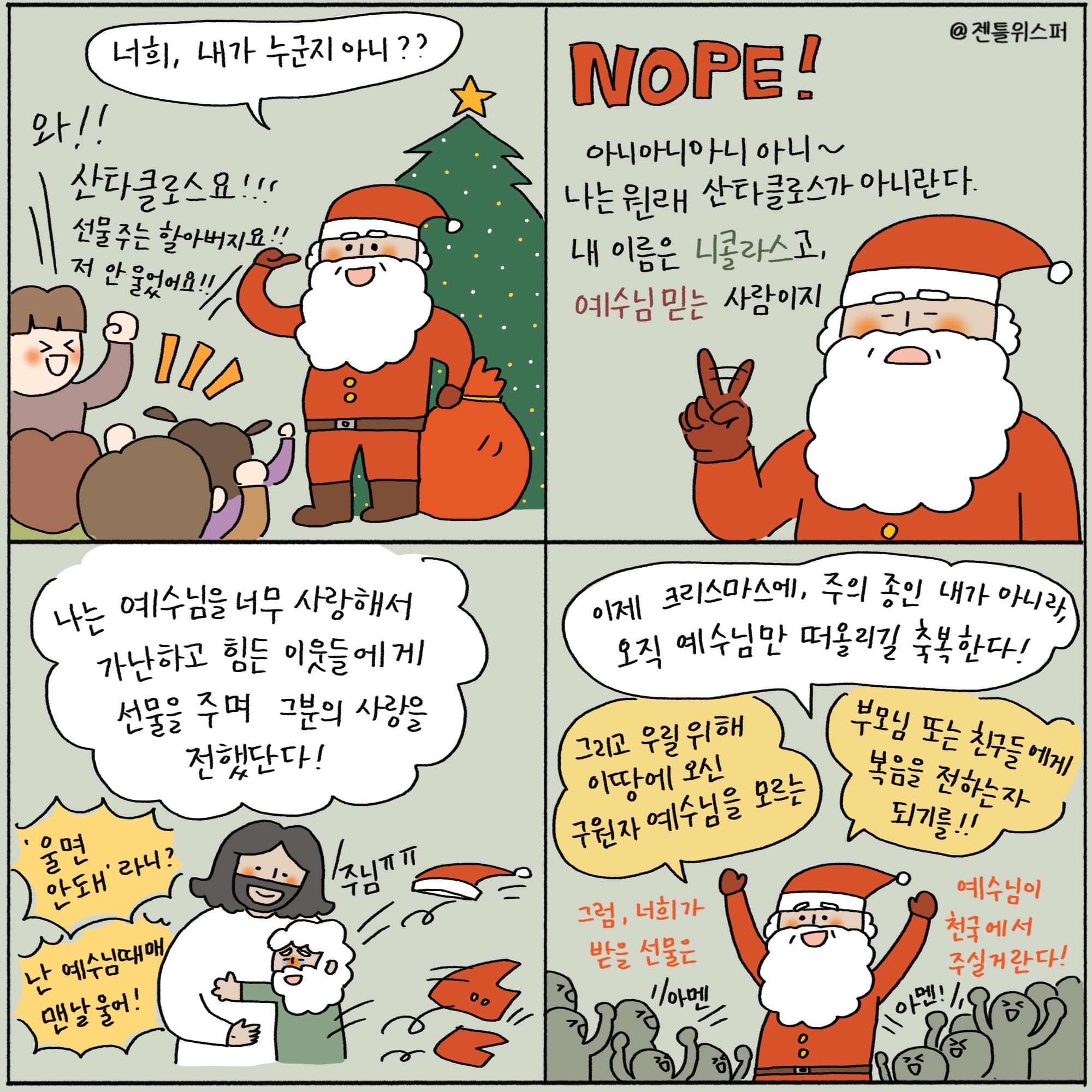 주보용 4컷 묵상 157 진짜 감사한 크리스마스 by 젠틀위스퍼 / 다운로드(파일)jpg / 2000*2000pixel / 300dpi / 677KB 주보용 4컷 묵상 145 약속을 성취하는 건 내 노력이 아니라 by 젠틀위스퍼 / 다운로드(파일)jpg / 2000*2000pixel / 300dpi / 535KB최세미 작가 작품활동 응원하기!지난 20년간 갓피플 만화는 주보 사용을 무료로 제공해왔습니다. 이제는 작가들에게 작은 정성을 표현하면 어떨까요? 주보 1회 사용시 1,000원의 자발적 결제 후 이용해주세요주보사용 자발적 결제1,000원작가에게 커피 한잔선물하기좋아요아멘개척교회 돕기 2025-12-12 · 1143 · 29 · 4성탄절 메리크리스마스 산타클로스 성 니콜라스 예수님믿는사람 하늘상급 진짜선물 천국God's gentle whisper_최세미더보기시편23:1널 위해 기도하고 있어!어떤 순간에도