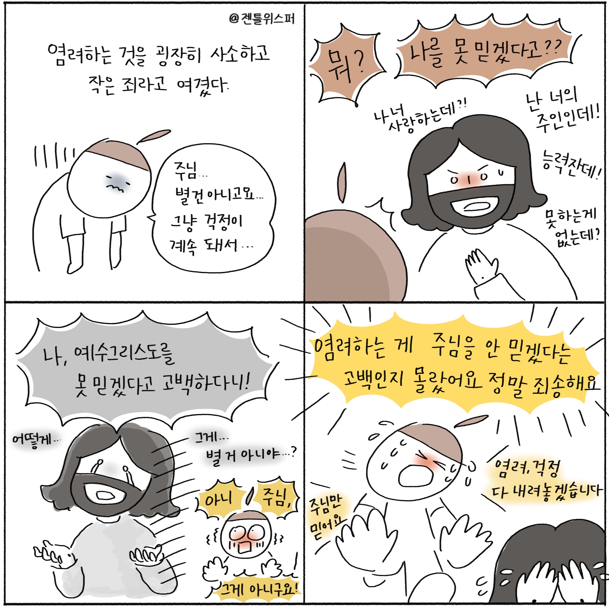 주보용 4컷 묵상 149 다시 오실 우리 왕 by 젠틀위스퍼 / 다운로드(파일)jpg / 2000*2000pixel / 300dpi / 0.97MB 주보용 4컷 묵상 141 죄의 기준은 오직 말씀 by 젠틀위스퍼 / 다운로드(파일)jpg / 2000*2000pixel / 300dpi / 0.98MB 주보용 4컷 묵상세트 19 (91~95) by 젠틀위스퍼 / 다운로드(파일)jpg / 2000*2000pixel / 300dpi최세미 작가 작품활동 응원하기!지난 20년간 갓피플 만화는 주보 사용을 무료로 제공해왔습니다. 이제는 작가들에게 작은 정성을 표현하면 어떨까요? 주보 1회 사용시 1,000원의 자발적 결제 후 이용해주세요주보사용 자발적 결제1,000원작가에게 커피 한잔선물하기좋아요아멘개척교회 돕기 2026-01-10 · 1308 · 24 · 9염려 걱정 두려움 불신 소망은 오직 예수님 회개 용서God's gentle whisper_최세미더보기시편23:1널 위해 기도하고 있어!어떤 순간에도