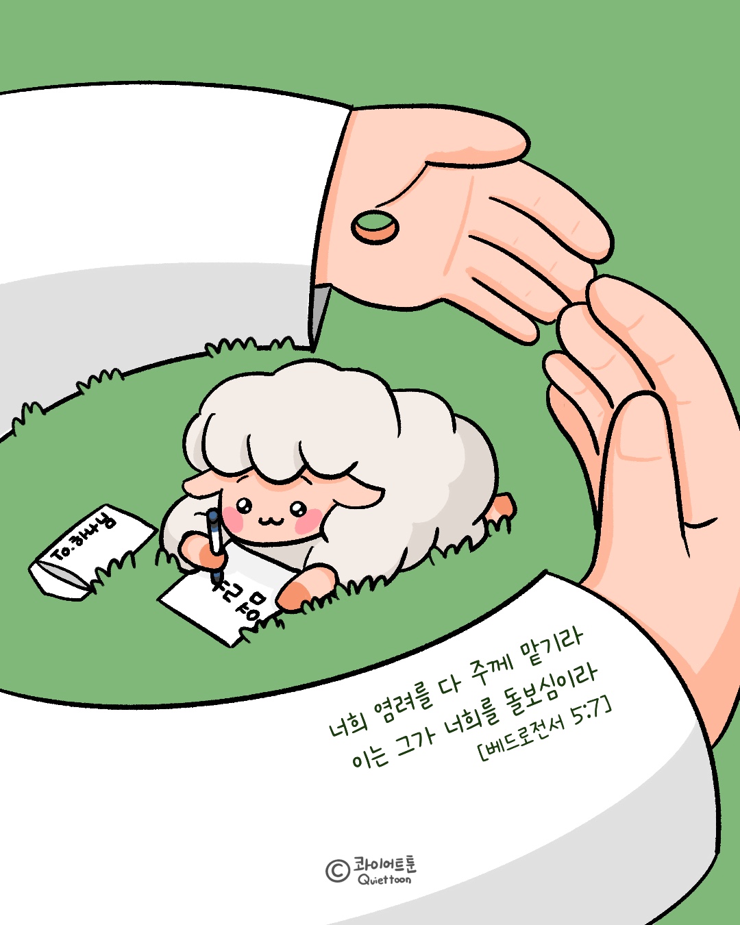 오늘도 말씀이 필요해 365 그림 일력콰이어트툰(홍기두) 오늘도 말씀이 필요해 Q&A 365 묵상 다이어리콰이어트툰(홍기두)홍기두 작가 작품활동 응원하기!지난 20년간 갓피플 만화는 주보 사용을 무료로 제공해왔습니다. 이제는 작가들에게 작은 정성을 표현하면 어떨까요? 주보 1회 사용시 1,000원의 자발적 결제 후 이용해주세요주보사용 자발적 결제1,000원작가에게 커피 한잔선물하기좋아요아멘개척교회 돕기 2026-01-16 · 1124 · 42 · 8그림묵상베드로전서염려편지콰이어트툰콰이어트툰_홍기두더보기너를 지키시기를 원하며그 수를 셀 수도 없나이다내 양은 내 음성을 들으며