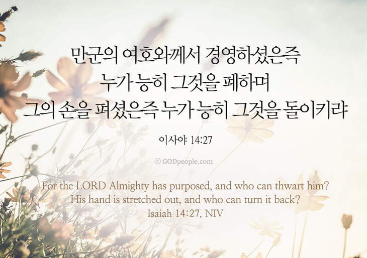 만군의 여호와께서 경영하셨은즉 누가 능히 그것을 폐하며 그의 손을 펴셨은즉 누가 능히 그것을 돌이키랴 – 사14:27 For the LORD Almighty has purposed, and who can thwart him? His hand is stretched out, and who can turn it back? – Isaiah 14:27, NIV ♥ 교도소 재소자에게 성경책을 보내드립니다. [플로잉전용상품] 재소자에게 성경책 보내기_우리말성경 단본(실버그린)우리말성경 단본 (무색인/무지퍼/페이퍼백/실버그린/DKV2406)두란노 편집부 [플로잉전용상품] 재소자에게 성경책 보내기_큰글로 읽는 우리말 비전성경 중단본(호박색)큰글로 읽는 우리말 비전성경 중단본(색인/무지퍼/PU/호박색/DKV2206)도서출판 두란노두란노 편집부 위 성경책을 구매 (플로잉 Flowing) 하시면 "프리즌 리바이벌 PRISON REVIVAL "을 통해서 국내 교정기관의 담장 안에서 지내시는 분들에게 전달됩니다.♥ 수용자 자녀에게 성경만화, 묵상365를 보내드립니다. [플로잉전용상품] 수용자 자녀에게 성경만화 보내기_만화 예수님의 생애 세트 (전3권)온 가족이 함께 보는 사복음서김동순 [플로잉전용상품] 수용자 자녀에게 성경만화 보내기_[개역개정판] 카툰성경 세트(완간/전3권)그린이 : 키이스 닐리, 데이비드 마일즈 [플로잉전용상품] 갓피플 통해 쌀 보내기_백미 (10kg)오픈스토리 [플로잉전용상품] 맛있는 반찬보내기_김치세트 (유기농백김치+겉절이)참식품주식회사 위 상품 구매 (플로잉 Flowing) 하시면 "세움"을 통해서 수용자(교도소 재소자) 자녀들에게 전달됩니다.+오늘의말씀으로 만들었어요♡ 오늘의말씀 아크릴 자석액자+말씀을 듣고 필사하세요♡ 개역개정 MP3 다운로드 | 태블릿으로 필사 | 종이노트로 필사 좋아요아멘개척교회 돕기 2021-09-24 · 3704 · 142 · 성경전도갓피플갓피플오늘의말씀말씀카드좋은성경구절이사야14장27절이사야_사14:27오늘의말씀더보기갓피플 오늘의말씀_에스겔36장36절갓피플 오늘의말씀_갈라디아서4장18절갓피플 오늘의말씀_누가복음6장23절