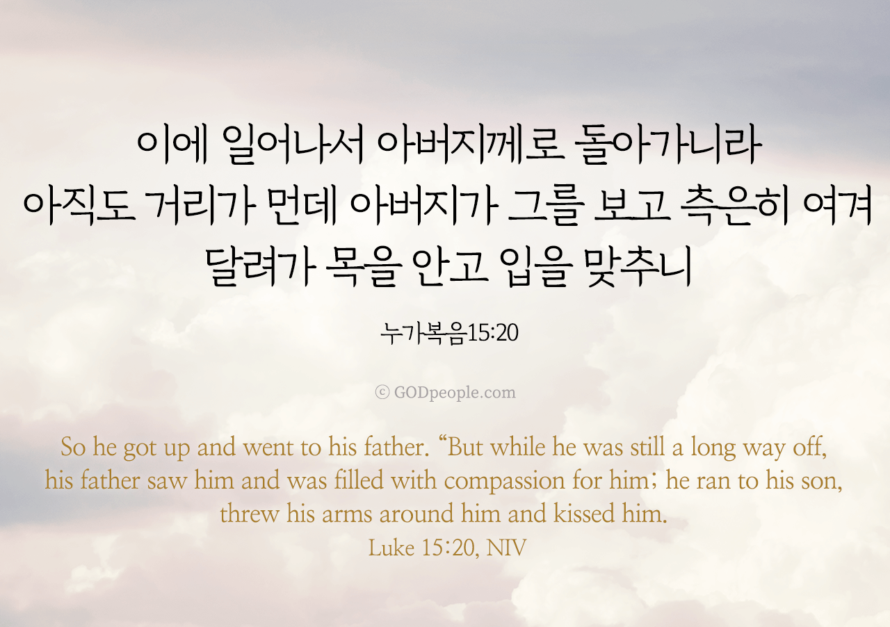 이에 일어나서 아버지께로 돌아가니라 아직도 거리가 먼데 아버지가 그를 보고 측은히 여겨 달려가 목을 안고 입을 맞추니 _누가복음 15:20