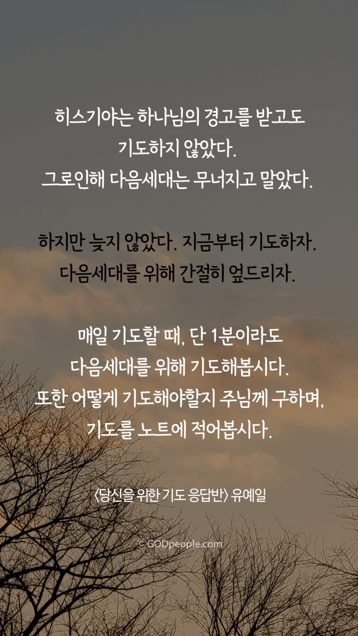 유혹 앞에서 무너진 다윗, 다음세대가 무너진다는 경고를 받고도 기도하지 않았던 히스기야. '기도'가 없었기 때문에 결과가 달라진 것입니다.