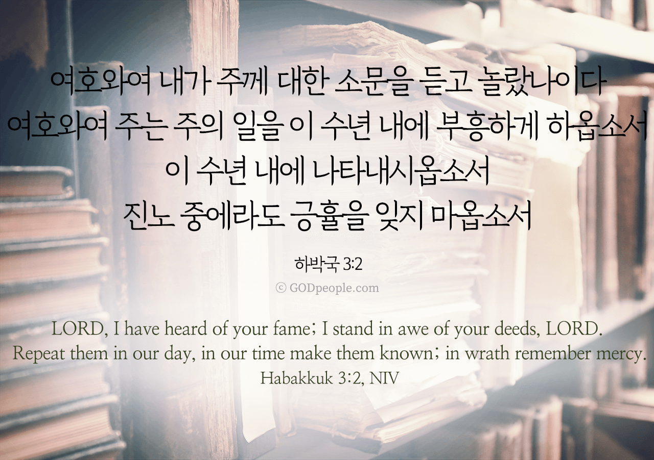 여호와여 내가 주께 대한 소문을 듣고 놀랐나이다 여호와여 주는 주의 일을 이 수년 내에 부흥하게 하옵소서 이 수년 내에 나타내시옵소서 진노 중에라도 긍휼을 잊지 마옵소서 _하박국 3:2