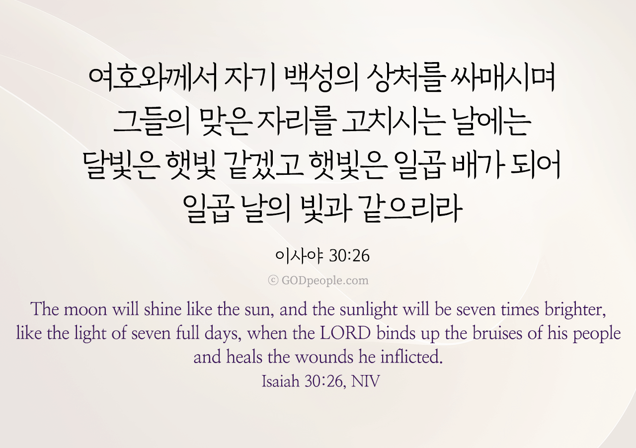 여호와께서 자기 백성의 상처를 싸매시며 그들의 맞은 자리를 고치시는 날에는 달빛은 햇빛 같겠고 햇빛은 일곱 배가 되어 일곱 날의 빛과 같으리라 _이사야 30:26![]()