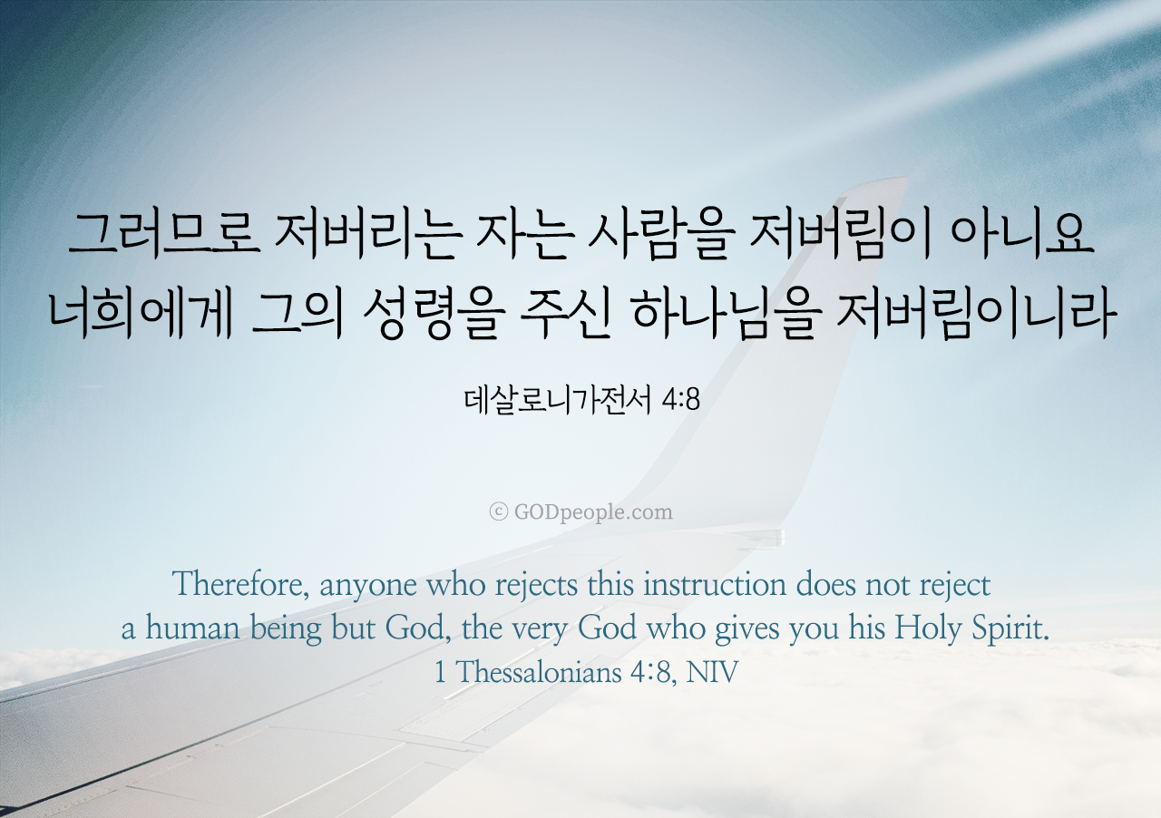 그러므로 저버리는 자는 사람을 저버림이 아니요 너희에게 그의 성령을 주신 하나님을 저버림이니라 _데살로니가전서 4:8Therefore, anyone who rejects this instruction does not reject a human being but God, the very God who gives you his Holy Spirit. _1 Thessalonians 4:8, NIV ♥ 교도소 재소자에게 성경책을 보내드립니다. [플로잉전용상품] 재소자에게 성경책 보내기_우리말성경 단본(실버그린)우리말성경 단본 (무색인/무지퍼/페이퍼백/실버그린/DKV2406)두란노 편집부 [플로잉전용상품] 재소자에게 성경책 보내기_큰글로 읽는 우리말 비전성경 중단본(호박색)큰글로 읽는 우리말 비전성경 중단본(색인/무지퍼/PU/호박색/DKV2206)도서출판 두란노두란노 편집부 위 성경책을 구매 (플로잉 Flowing) 하시면 "프리즌 리바이벌 PRISON REVIVAL "을 통해서 국내 교정기관의 담장 안에서 지내시는 분들에게 전달됩니다.♥ 수용자 자녀에게 성경만화, 묵상365를 보내드립니다. [플로잉전용상품] 수용자 자녀에게 성경만화 보내기_만화 예수님의 생애 세트 (전3권)온 가족이 함께 보는 사복음서김동순 [플로잉전용상품] 수용자 자녀에게 성경만화 보내기_[개역개정판] 카툰성경 세트(완간/전3권)그린이 : 키이스 닐리, 데이비드 마일즈 [플로잉전용상품] 갓피플 통해 쌀 보내기_백미 (10kg)오픈스토리 [플로잉전용상품] 맛있는 반찬보내기_김치세트 (유기농백김치+겉절이)참식품주식회사 위 상품 구매 (플로잉 Flowing) 하시면 "세움"을 통해서 수용자(교도소 재소자) 자녀들에게 전달됩니다.+오늘의말씀으로 만들었어요♡ 오늘의말씀 아크릴 자석액자+말씀을 듣고 필사하세요♡ 개역개정 MP3 다운로드 | 태블릿으로 필사 | 종이노트로 필사 좋아요아멘개척교회 돕기 2026-03-18 · 2179 · 189 · 오늘의말씀 말씀카드 데살로니가전서4장8절 전도오늘의말씀더보기갓피플 오늘의말씀_에스겔36장36절갓피플 오늘의말씀_갈라디아서4장18절갓피플 오늘의말씀_누가복음6장23절