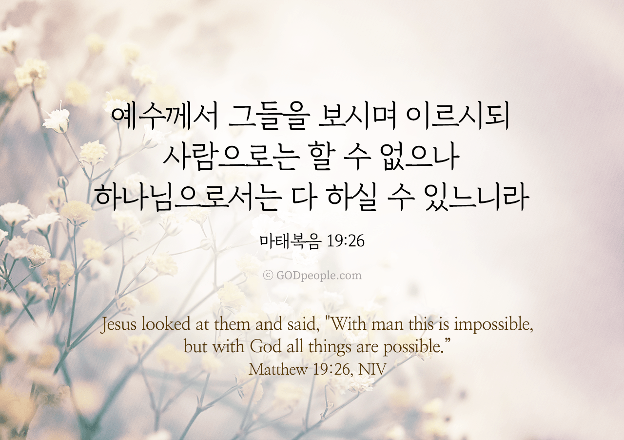 예수께서 그들을 보시며 이르시되 사람으로는 할 수 없으나 하나님으로서는 다 하실 수 있느니라 _마태복음 19:26Jesus looked at them and said, "With man this is impossible, but with God all things are possible." _Matthew 19:26, NIV ♥ 교도소 재소자에게 성경책을 보내드립니다. [플로잉전용상품] 재소자에게 성경책 보내기_우리말성경 단본(실버그린)우리말성경 단본 (무색인/무지퍼/페이퍼백/실버그린/DKV2406)두란노 편집부 [플로잉전용상품] 재소자에게 성경책 보내기_큰글로 읽는 우리말 비전성경 중단본(호박색)큰글로 읽는 우리말 비전성경 중단본(색인/무지퍼/PU/호박색/DKV2206)도서출판 두란노두란노 편집부 위 성경책을 구매 (플로잉 Flowing) 하시면 "프리즌 리바이벌 PRISON REVIVAL "을 통해서 국내 교정기관의 담장 안에서 지내시는 분들에게 전달됩니다.♥ 수용자 자녀에게 성경만화, 묵상365를 보내드립니다. [플로잉전용상품] 수용자 자녀에게 성경만화 보내기_만화 예수님의 생애 세트 (전3권)온 가족이 함께 보는 사복음서김동순 [플로잉전용상품] 수용자 자녀에게 성경만화 보내기_[개역개정판] 카툰성경 세트(완간/전3권)그린이 : 키이스 닐리, 데이비드 마일즈 [플로잉전용상품] 갓피플 통해 쌀 보내기_백미 (10kg)오픈스토리 [플로잉전용상품] 맛있는 반찬보내기_김치세트 (유기농백김치+겉절이)참식품주식회사 위 상품 구매 (플로잉 Flowing) 하시면 "세움"을 통해서 수용자(교도소 재소자) 자녀들에게 전달됩니다.+오늘의말씀으로 만들었어요♡ 오늘의말씀 아크릴 자석액자+말씀을 듣고 필사하세요♡ 개역개정 MP3 다운로드 | 태블릿으로 필사 | 종이노트로 필사 좋아요아멘개척교회 돕기 2026-03-21 · 2345 · 206 · 오늘의말씀 말씀카드 마태복음19장25절 전도오늘의말씀더보기갓피플 오늘의말씀_마가복음1장11절_2018.6.28갓피플 오늘의말씀_요한복음20장22절_2018.6.26갓피플 오늘의말씀_마가복음1장17절_2018.6.29