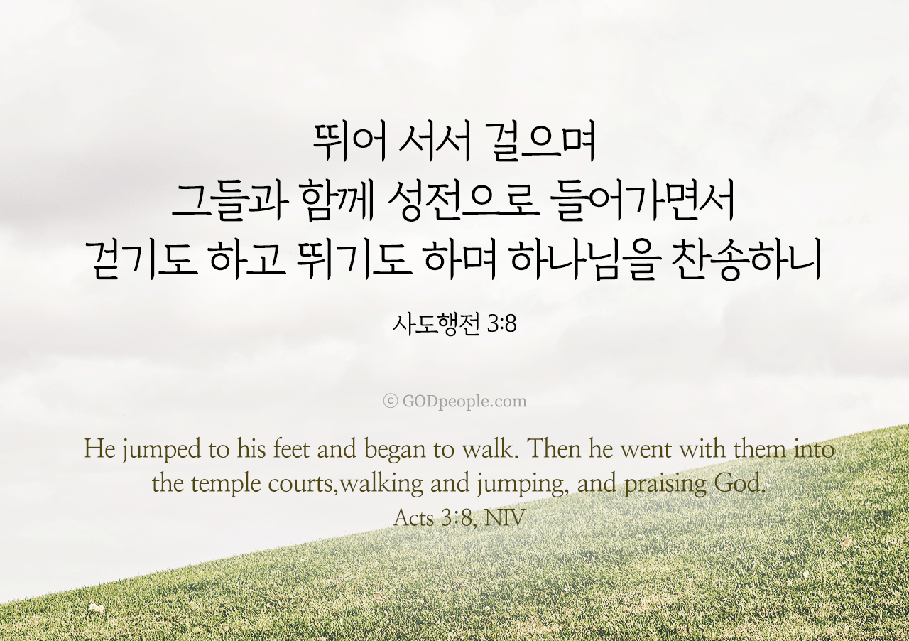 뛰어 서서 걸으며 그들과 함께 성전으로 들어가면서 걷기도 하고 뛰기도 하며 하나님을 찬송하니 _사도행전 3:8He jumped to his feet and began to walk. Then he went with them into the temple courts, walking and jumping, and praising God. _Acts 3:8, NIV ♥ 교도소 재소자에게 성경책을 보내드립니다. [플로잉전용상품] 재소자에게 성경책 보내기_우리말성경 단본(실버그린)우리말성경 단본 (무색인/무지퍼/페이퍼백/실버그린/DKV2406)두란노 편집부 [플로잉전용상품] 재소자에게 성경책 보내기_큰글로 읽는 우리말 비전성경 중단본(호박색)큰글로 읽는 우리말 비전성경 중단본(색인/무지퍼/PU/호박색/DKV2206)도서출판 두란노두란노 편집부 위 성경책을 구매 (플로잉 Flowing) 하시면 "프리즌 리바이벌 PRISON REVIVAL "을 통해서 국내 교정기관의 담장 안에서 지내시는 분들에게 전달됩니다.♥ 수용자 자녀에게 성경만화, 묵상365를 보내드립니다. [플로잉전용상품] 수용자 자녀에게 성경만화 보내기_만화 예수님의 생애 세트 (전3권)온 가족이 함께 보는 사복음서김동순 [플로잉전용상품] 수용자 자녀에게 성경만화 보내기_[개역개정판] 카툰성경 세트(완간/전3권)그린이 : 키이스 닐리, 데이비드 마일즈 [플로잉전용상품] 갓피플 통해 쌀 보내기_백미 (10kg)오픈스토리 [플로잉전용상품] 맛있는 반찬보내기_김치세트 (유기농백김치+겉절이)참식품주식회사 위 상품 구매 (플로잉 Flowing) 하시면 "세움"을 통해서 수용자(교도소 재소자) 자녀들에게 전달됩니다.+오늘의말씀으로 만들었어요♡ 오늘의말씀 아크릴 자석액자+말씀을 듣고 필사하세요♡ 개역개정 MP3 다운로드 | 태블릿으로 필사 | 종이노트로 필사 좋아요아멘개척교회 돕기 2026-03-26 · 2179 · 209 · 1오늘의말씀 말씀카드 사도행전3장8절 전도오늘의말씀더보기갓피플 오늘의말씀_마가복음1장11절_2018.6.28갓피플 오늘의말씀_요한복음20장22절_2018.6.26갓피플 오늘의말씀_마가복음1장17절_2018.6.29