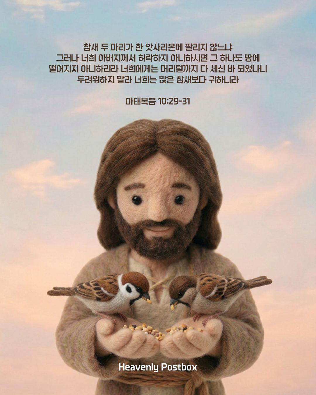 이런 참새도 굶지 않고 살아가도록 세밀하게 먹이시고 입히시는 분이 바로 우리 아버지 하나님이신데... 하물며 우주에 하나뿐인 당신의 독생자 피 값으로 사신 자녀 된 우리들의 필요를 아버지께서 모르실 리 없습니다. 심지어 우리의 머리카락 숫자까지 하나하나 다 세신다고 하시니 두말 할 필요가 없습니다. 우리의 모든 일거수일투족을 주목하고 계시는 하나님 앞에 우리 삶의 단 한 순간도 그분의 시선에서 벗어나는 일은 없을 것입니다. 우리는 이런 사랑과 보호를 받고 사는 하나님 아버지의 자녀들입니다.