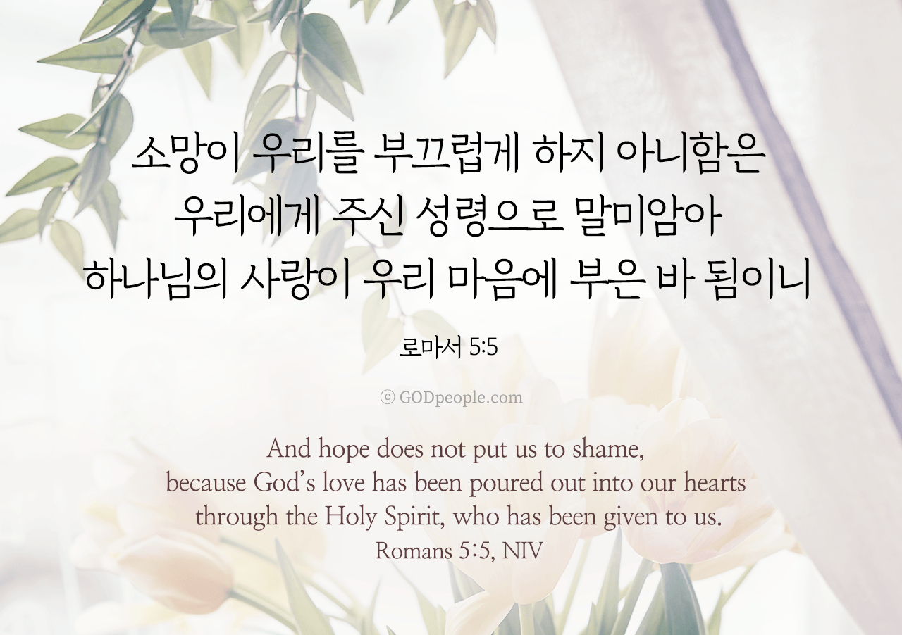 소망이 우리를 부끄럽게 하지 아니함은 우리에게 주신 성령으로 말미암아 하나님의 사랑이 우리 마음에 부은 바 됨이니 _로마서 5:5And hope does not put us to shame, because God's love has been poured out into our hearts through the Holy Spirit, who has been given to us. _Romans 5:5, NIV ♥ 교도소 재소자에게 성경책을 보내드립니다. [플로잉전용상품] 재소자에게 성경책 보내기_우리말성경 단본(실버그린)우리말성경 단본 (무색인/무지퍼/페이퍼백/실버그린/DKV2406)두란노 편집부 [플로잉전용상품] 재소자에게 성경책 보내기_큰글로 읽는 우리말 비전성경 중단본(호박색)큰글로 읽는 우리말 비전성경 중단본(색인/무지퍼/PU/호박색/DKV2206)도서출판 두란노두란노 편집부 위 성경책을 구매 (플로잉 Flowing) 하시면 "프리즌 리바이벌 PRISON REVIVAL "을 통해서 국내 교정기관의 담장 안에서 지내시는 분들에게 전달됩니다.♥ 수용자 자녀에게 성경만화, 묵상365를 보내드립니다. [플로잉전용상품] 수용자 자녀에게 성경만화 보내기_만화 예수님의 생애 세트 (전3권)온 가족이 함께 보는 사복음서김동순 [플로잉전용상품] 수용자 자녀에게 성경만화 보내기_[개역개정판] 카툰성경 세트(완간/전3권)그린이 : 키이스 닐리, 데이비드 마일즈 [플로잉전용상품] 갓피플 통해 쌀 보내기_백미 (10kg)오픈스토리 [플로잉전용상품] 맛있는 반찬보내기_김치세트 (유기농백김치+겉절이)참식품주식회사 위 상품 구매 (플로잉 Flowing) 하시면 "세움"을 통해서 수용자(교도소 재소자) 자녀들에게 전달됩니다.+오늘의말씀으로 만들었어요♡ 오늘의말씀 아크릴 자석액자+말씀을 듣고 필사하세요♡ 개역개정 MP3 다운로드 | 태블릿으로 필사 | 종이노트로 필사 좋아요아멘개척교회 돕기 2026-03-29 · 1612 · 135 · 오늘의말씀말씀카드로마서5장5절전도오늘의말씀더보기갓피플 오늘의말씀_마가복음14장7절갓피플 오늘의말씀_하박국3장2절갓피플 오늘의말씀_마태복음12장8절