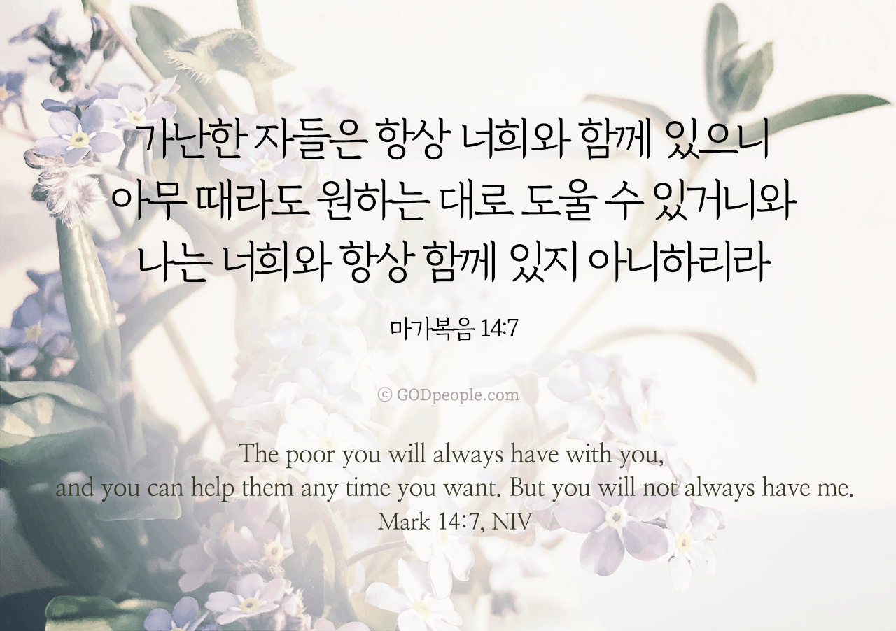 가난한 자들은 항상 너희와 함께 있으니 아무 때라도 원하는 대로 도울 수 있거니와 나는 너희와 항상 함께 있지 아니하리라 _마가복음 14:7The poor you will always have with you, and you can help them any time you want. But you will not always have me. _Mark 14:7, NIV ♥ 교도소 재소자에게 성경책을 보내드립니다. [플로잉전용상품] 재소자에게 성경책 보내기_우리말성경 단본(실버그린)우리말성경 단본 (무색인/무지퍼/페이퍼백/실버그린/DKV2406)두란노 편집부 [플로잉전용상품] 재소자에게 성경책 보내기_큰글로 읽는 우리말 비전성경 중단본(호박색)큰글로 읽는 우리말 비전성경 중단본(색인/무지퍼/PU/호박색/DKV2206)도서출판 두란노두란노 편집부 위 성경책을 구매 (플로잉 Flowing) 하시면 "프리즌 리바이벌 PRISON REVIVAL "을 통해서 국내 교정기관의 담장 안에서 지내시는 분들에게 전달됩니다.♥ 수용자 자녀에게 성경만화, 묵상365를 보내드립니다. [플로잉전용상품] 수용자 자녀에게 성경만화 보내기_만화 예수님의 생애 세트 (전3권)온 가족이 함께 보는 사복음서김동순 [플로잉전용상품] 수용자 자녀에게 성경만화 보내기_[개역개정판] 카툰성경 세트(완간/전3권)그린이 : 키이스 닐리, 데이비드 마일즈 [플로잉전용상품] 갓피플 통해 쌀 보내기_백미 (10kg)오픈스토리 [플로잉전용상품] 맛있는 반찬보내기_김치세트 (유기농백김치+겉절이)참식품주식회사 위 상품 구매 (플로잉 Flowing) 하시면 "세움"을 통해서 수용자(교도소 재소자) 자녀들에게 전달됩니다.+오늘의말씀으로 만들었어요♡ 오늘의말씀 아크릴 자석액자+말씀을 듣고 필사하세요♡ 개역개정 MP3 다운로드 | 태블릿으로 필사 | 종이노트로 필사 좋아요아멘개척교회 돕기 2026-04-02 · 2077 · 196 · 오늘의말씀 말씀카드 마가복음14장7절 전도오늘의말씀더보기갓피플 오늘의말씀_마가복음1장11절_2018.6.28갓피플 오늘의말씀_요한복음20장22절_2018.6.26갓피플 오늘의말씀_마가복음1장17절_2018.6.29