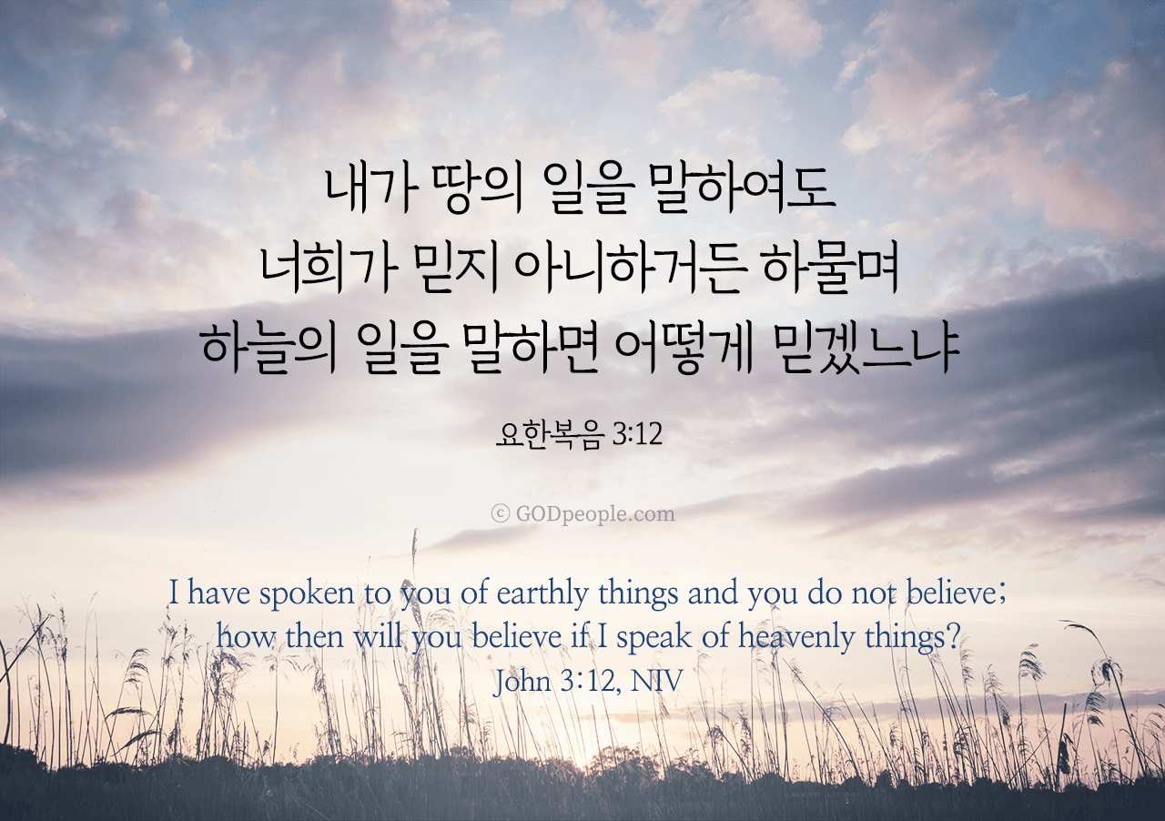 내가 땅의 일을 말하여도 너희가 믿지 아니하거든 하물며 하늘의 일을 말하면 어떻게 믿겠느냐 _요한복음 3:12I have spoken to you of earthly things and you do not believe; how then will you believe if I speak of heavenly things? _John 3:12, NIV ♥ 교도소 재소자에게 성경책을 보내드립니다. [플로잉전용상품] 재소자에게 성경책 보내기_우리말성경 단본(실버그린)우리말성경 단본 (무색인/무지퍼/페이퍼백/실버그린/DKV2406)두란노 편집부 [플로잉전용상품] 재소자에게 성경책 보내기_큰글로 읽는 우리말 비전성경 중단본(호박색)큰글로 읽는 우리말 비전성경 중단본(색인/무지퍼/PU/호박색/DKV2206)도서출판 두란노두란노 편집부 위 성경책을 구매 (플로잉 Flowing) 하시면 "프리즌 리바이벌 PRISON REVIVAL "을 통해서 국내 교정기관의 담장 안에서 지내시는 분들에게 전달됩니다.♥ 수용자 자녀에게 성경만화, 묵상365를 보내드립니다. [플로잉전용상품] 수용자 자녀에게 성경만화 보내기_만화 예수님의 생애 세트 (전3권)온 가족이 함께 보는 사복음서김동순 [플로잉전용상품] 수용자 자녀에게 성경만화 보내기_[개역개정판] 카툰성경 세트(완간/전3권)그린이 : 키이스 닐리, 데이비드 마일즈 [플로잉전용상품] 갓피플 통해 쌀 보내기_백미 (10kg)오픈스토리 [플로잉전용상품] 맛있는 반찬보내기_김치세트 (유기농백김치+겉절이)참식품주식회사 위 상품 구매 (플로잉 Flowing) 하시면 "세움"을 통해서 수용자(교도소 재소자) 자녀들에게 전달됩니다.+오늘의말씀으로 만들었어요♡ 오늘의말씀 아크릴 자석액자+말씀을 듣고 필사하세요♡ 개역개정 MP3 다운로드 | 태블릿으로 필사 | 종이노트로 필사 좋아요아멘개척교회 돕기 2026-04-03 · 2095 · 209 · 오늘의말씀 말씀카드 요한복음3장12절 전도오늘의말씀더보기갓피플 오늘의말씀_마가복음1장11절_2018.6.28갓피플 오늘의말씀_요한복음20장22절_2018.6.26갓피플 오늘의말씀_마가복음1장17절_2018.6.29