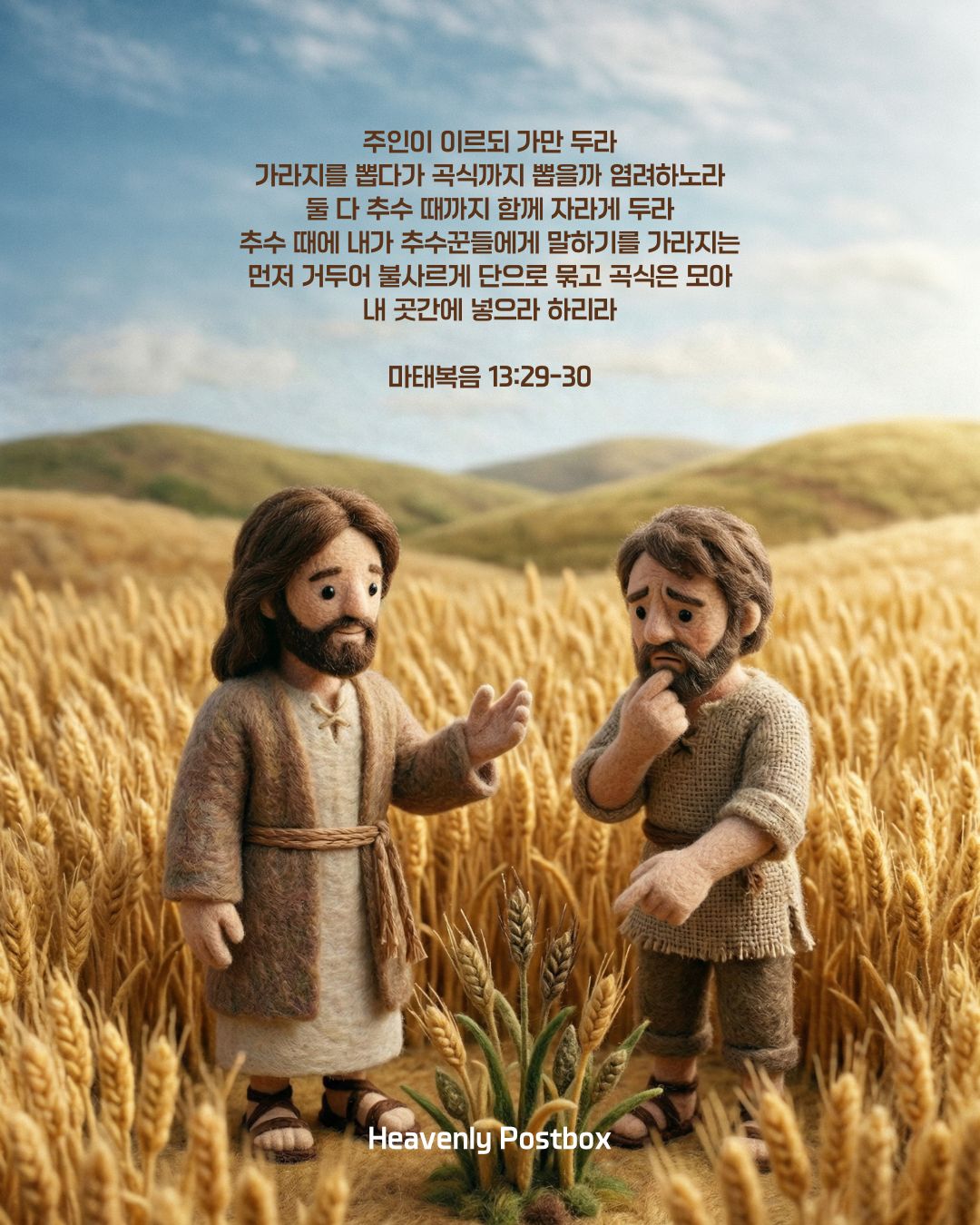 그렇다면 왜 주인은 이토록 사악한 가라지들을 당장 뽑지 말고 추수 때까지 두라고 하셨을까? 의문이 듭니다. 그러한 가라지조차 무조건적으로 사랑하셔서 끝까지 회개의 기회를 주시는 하나님의 긍휼 때문이라 생각합니다. 또한 가라지를 뽑다가 혹여나 실족하여 넘어질 지도 모를 진짜 알곡들을 보호하시려는 아버지의 세심한 배려입니다. "너는 마귀의 자식들이니까 당장 뽑아버리겠다"가 아니라 그들마저도 끝까지 사랑하사 한 사람이라도 돌이켜 회개하기를 기다리시는 것입니다. 그렇게 해서 구원받은 자가 바로... '니고데모'입니다.