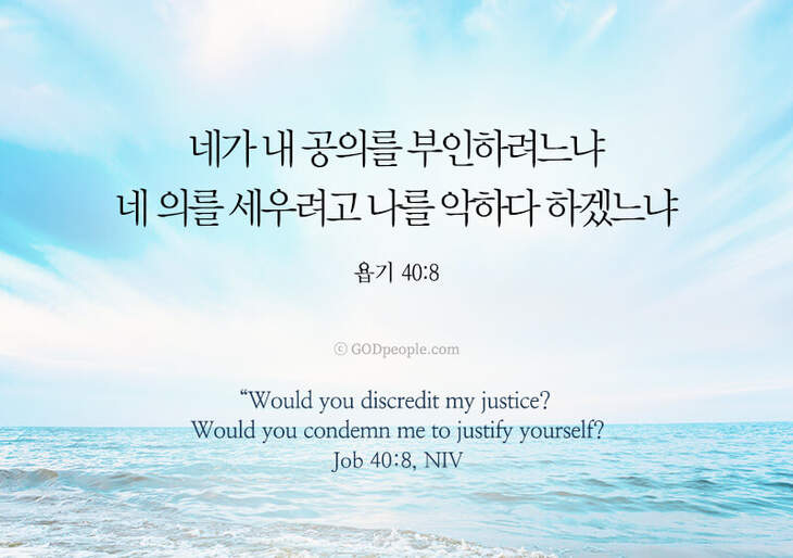 네가 내 공의를 부인하려느냐 네 의를 세우려고 나를 악하다 하겠느냐 – 욥40:8 "Would you discredit my justice? Would you condemn me to justify yourself? – Job 40:8, NIV ♥ 교도소 재소자에게 성경책을 보내드립니다. [플로잉전용상품] 재소자에게 성경책 보내기_우리말성경 단본(실버그린)우리말성경 단본 (무색인/무지퍼/페이퍼백/실버그린/DKV2406)두란노 편집부 [플로잉전용상품] 재소자에게 성경책 보내기_큰글로 읽는 우리말 비전성경 중단본(호박색)큰글로 읽는 우리말 비전성경 중단본(색인/무지퍼/PU/호박색/DKV2206)도서출판 두란노두란노 편집부 위 성경책을 구매 (플로잉 Flowing) 하시면 "프리즌 리바이벌 PRISON REVIVAL "을 통해서 국내 교정기관의 담장 안에서 지내시는 분들에게 전달됩니다.♥ 수용자 자녀에게 성경만화, 묵상365를 보내드립니다. [플로잉전용상품] 수용자 자녀에게 성경만화 보내기_만화 예수님의 생애 세트 (전3권)온 가족이 함께 보는 사복음서김동순 [플로잉전용상품] 수용자 자녀에게 성경만화 보내기_[개역개정판] 카툰성경 세트(완간/전3권)그린이 : 키이스 닐리, 데이비드 마일즈 [플로잉전용상품] 갓피플 통해 쌀 보내기_백미 (10kg)오픈스토리 [플로잉전용상품] 맛있는 반찬보내기_김치세트 (유기농백김치+겉절이)참식품주식회사 위 상품 구매 (플로잉 Flowing) 하시면 "세움"을 통해서 수용자(교도소 재소자) 자녀들에게 전달됩니다.+오늘의말씀으로 만들었어요♡ 오늘의말씀 아크릴 자석액자+말씀을 듣고 필사하세요♡ 개역개정 MP3 다운로드 | 태블릿으로 필사 | 종이노트로 필사 좋아요아멘개척교회 돕기 2021-10-22 · 2863 · 109 · 성경전도갓피플갓피플오늘의말씀말씀카드욥기좋은성경구절_욥40:8욥기40장8절오늘의말씀더보기갓피플 오늘의말씀_에스겔36장36절갓피플 오늘의말씀_갈라디아서4장18절갓피플 오늘의말씀_누가복음6장23절