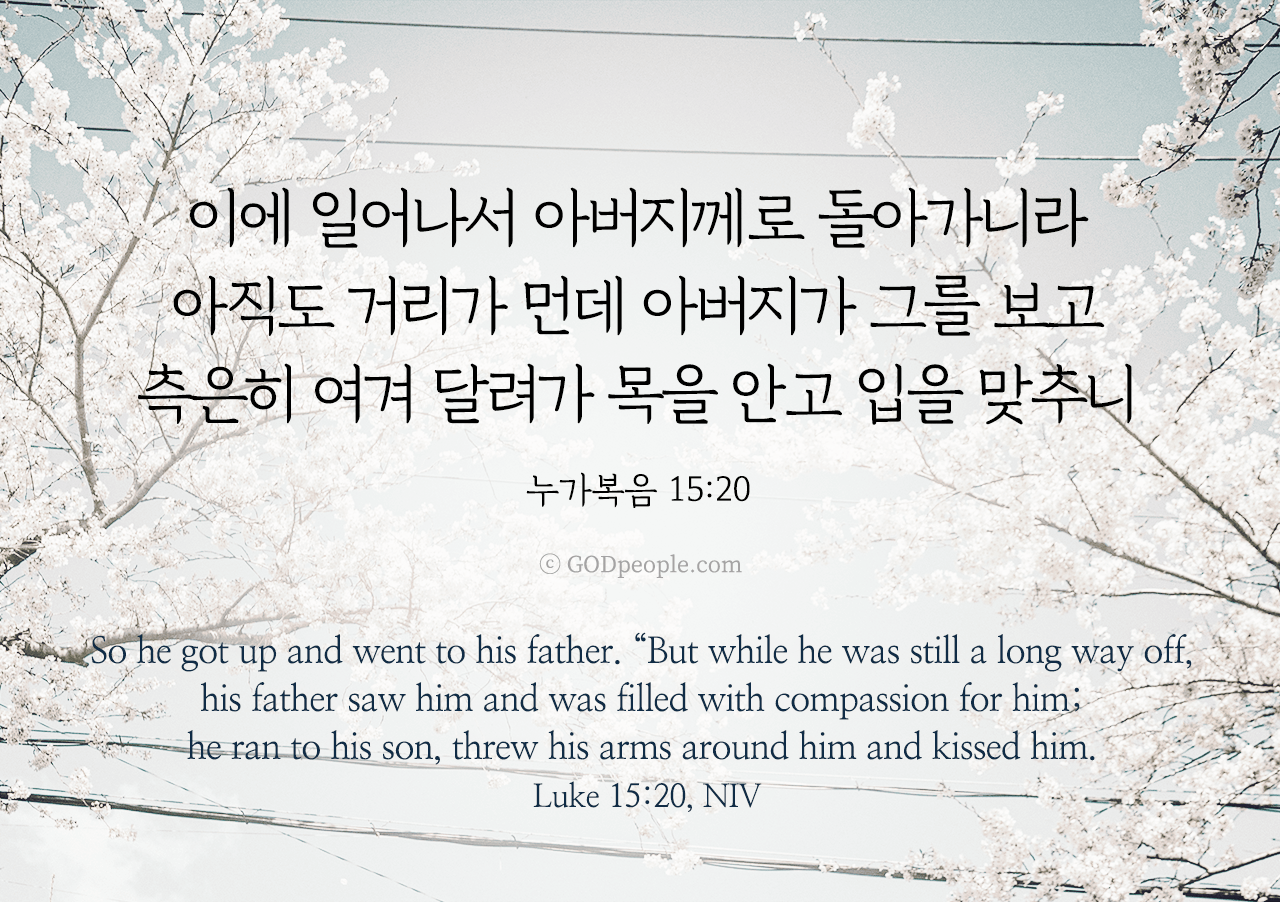 이에 일어나서 아버지께로 돌아가니라 아직도 거리가 먼데 아버지가 그를 보고 측은히 여겨 달려가 목을 안고 입을 맞추니 _누가복음 15:20