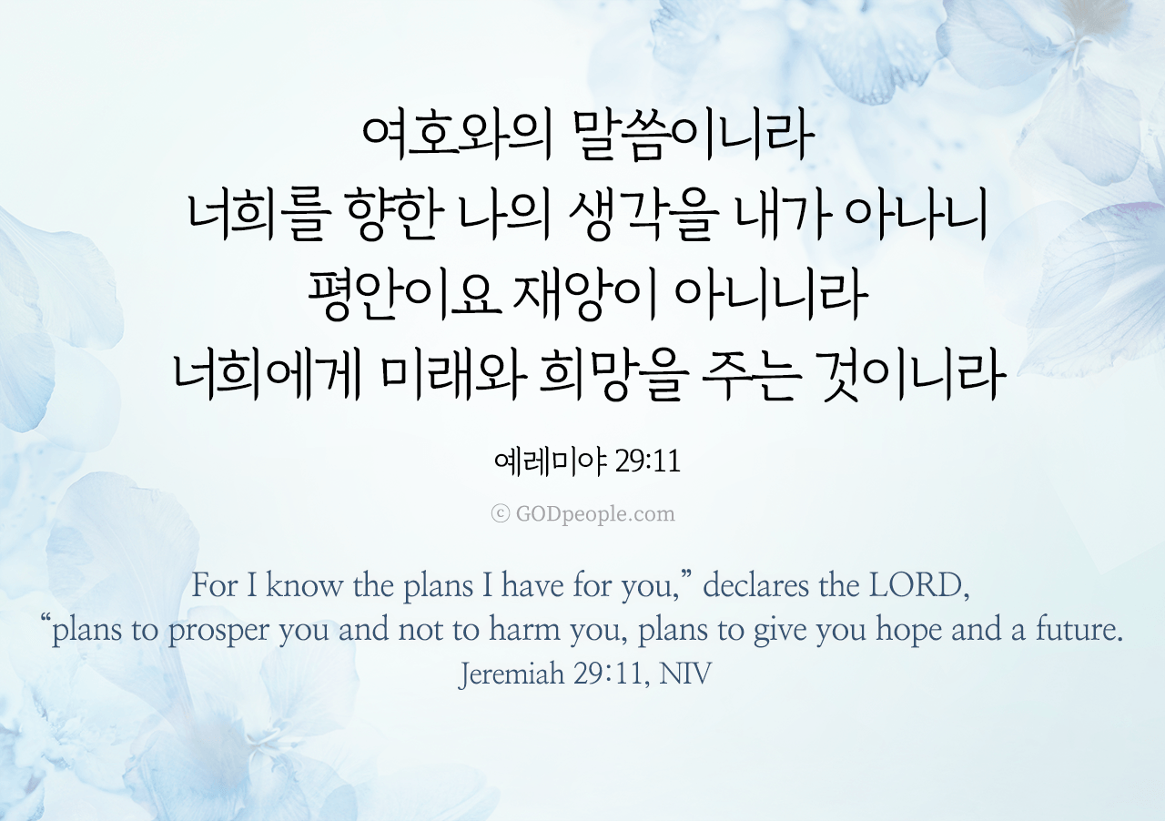 여호와의 말씀이니라 너희를 향한 나의 생각을 내가 아나니 평안이요 재앙이 아니니라 너희에게 미래와 희망을 주는 것이니라 _예레미야 29:11For I know the plans I have for you," declares the LORD, "plans to prosper you and not to harm you, plans to give you hope and a future. _Jeremiah 29:11, NIV ♥ 교도소 재소자에게 성경책을 보내드립니다. [플로잉전용상품] 재소자에게 성경책 보내기_우리말성경 단본(실버그린)우리말성경 단본 (무색인/무지퍼/페이퍼백/실버그린/DKV2406)두란노 편집부 [플로잉전용상품] 재소자에게 성경책 보내기_큰글로 읽는 우리말 비전성경 중단본(호박색)큰글로 읽는 우리말 비전성경 중단본(색인/무지퍼/PU/호박색/DKV2206)도서출판 두란노두란노 편집부 위 성경책을 구매 (플로잉 Flowing) 하시면 "프리즌 리바이벌 PRISON REVIVAL "을 통해서 국내 교정기관의 담장 안에서 지내시는 분들에게 전달됩니다.♥ 수용자 자녀에게 성경만화, 묵상365를 보내드립니다. [플로잉전용상품] 수용자 자녀에게 성경만화 보내기_만화 예수님의 생애 세트 (전3권)온 가족이 함께 보는 사복음서김동순 [플로잉전용상품] 수용자 자녀에게 성경만화 보내기_[개역개정판] 카툰성경 세트(완간/전3권)그린이 : 키이스 닐리, 데이비드 마일즈 [플로잉전용상품] 갓피플 통해 쌀 보내기_백미 (10kg)오픈스토리 [플로잉전용상품] 맛있는 반찬보내기_김치세트 (유기농백김치+겉절이)참식품주식회사 위 상품 구매 (플로잉 Flowing) 하시면 "세움"을 통해서 수용자(교도소 재소자) 자녀들에게 전달됩니다.+오늘의말씀으로 만들었어요♡ 오늘의말씀 아크릴 자석액자+말씀을 듣고 필사하세요♡ 개역개정 MP3 다운로드 | 태블릿으로 필사 | 종이노트로 필사 좋아요아멘개척교회 돕기 2026-04-05 · 1934 · 171 · 오늘의말씀 말씀카드 예레미야29장11절 전도오늘의말씀더보기갓피플 오늘의말씀_마가복음1장11절_2018.6.28갓피플 오늘의말씀_요한복음20장22절_2018.6.26갓피플 오늘의말씀_마가복음1장17절_2018.6.29