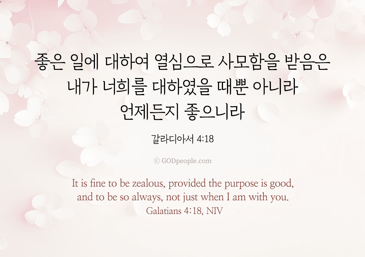 좋은 일에 대하여 열심으로 사모함을 받음은 내가 너희를 대하였을 때뿐 아니라 언제든지 좋으니라 _갈라디아서 4:18It is fine to be zealous, provided the purpose is good, and to be so always, not just when I am with you. _Galatians 4:18, NIV ♥ 교도소 재소자에게 성경책을 보내드립니다. [플로잉전용상품] 재소자에게 성경책 보내기_우리말성경 단본(실버그린)우리말성경 단본 (무색인/무지퍼/페이퍼백/실버그린/DKV2406)두란노 편집부 [플로잉전용상품] 재소자에게 성경책 보내기_큰글로 읽는 우리말 비전성경 중단본(호박색)큰글로 읽는 우리말 비전성경 중단본(색인/무지퍼/PU/호박색/DKV2206)도서출판 두란노두란노 편집부 위 성경책을 구매 (플로잉 Flowing) 하시면 "프리즌 리바이벌 PRISON REVIVAL "을 통해서 국내 교정기관의 담장 안에서 지내시는 분들에게 전달됩니다.♥ 수용자 자녀에게 성경만화, 묵상365를 보내드립니다. [플로잉전용상품] 수용자 자녀에게 성경만화 보내기_만화 예수님의 생애 세트 (전3권)온 가족이 함께 보는 사복음서김동순 [플로잉전용상품] 수용자 자녀에게 성경만화 보내기_[개역개정판] 카툰성경 세트(완간/전3권)그린이 : 키이스 닐리, 데이비드 마일즈 [플로잉전용상품] 갓피플 통해 쌀 보내기_백미 (10kg)오픈스토리 [플로잉전용상품] 맛있는 반찬보내기_김치세트 (유기농백김치+겉절이)참식품주식회사 위 상품 구매 (플로잉 Flowing) 하시면 "세움"을 통해서 수용자(교도소 재소자) 자녀들에게 전달됩니다.+오늘의말씀으로 만들었어요♡ 오늘의말씀 아크릴 자석액자+말씀을 듣고 필사하세요♡ 개역개정 MP3 다운로드 | 태블릿으로 필사 | 종이노트로 필사 좋아요아멘개척교회 돕기 2026-04-08 · 1950 · · 오늘의말씀 말씀카드 갈라디아서4장18절 전도오늘의말씀더보기갓피플 오늘의말씀_마가복음1장11절_2018.6.28갓피플 오늘의말씀_요한복음20장22절_2018.6.26갓피플 오늘의말씀_마가복음1장17절_2018.6.29
