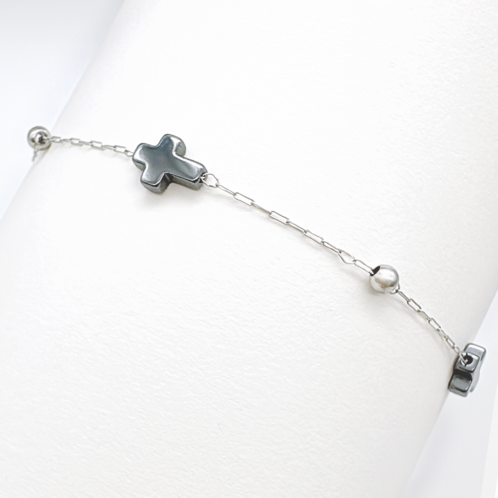 가느다란 체인 위에 블랙스톤 십자가가 포인트로 들어간 베이직하고 세련된 체인 팔찌입니다.