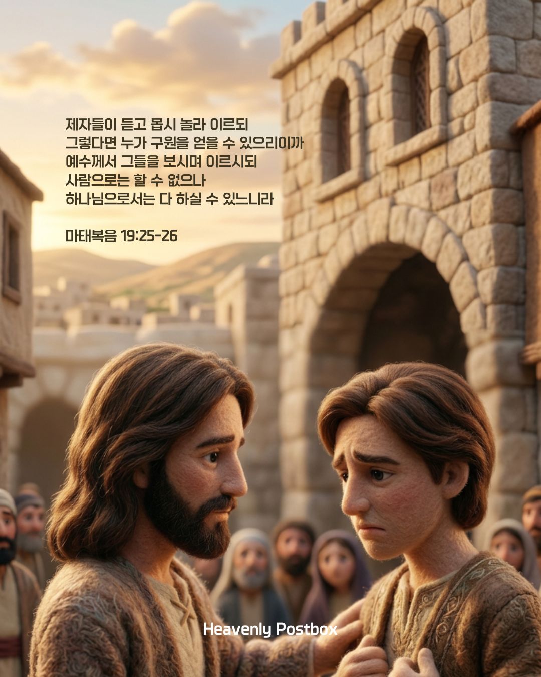 사람으로는 할 수 없지만 하나님께로 가면 할 수 있다는 진리... 이것이 바로 예수님께서 청년에게 들려주기 원하셨던 '결론'이었습니다. 부자 청년은 율법의 높은 수준을 절대로 만족시킬 수 없는 자신의 모습을 직면하고 “그러면 어찌해야 합니까?”라고 예수님 앞에 무릎을 꿇고 절박하게 질문했어야 했습니다. 그러나 부자 청년은 여전히 자기 의를 의지한 채 슬픈 얼굴로 물러나 버렸기에, 그의 삶을 송두리째 바꿀 예수님의 이 '결론'을 들을 기회를 놓치고 말았습니다.