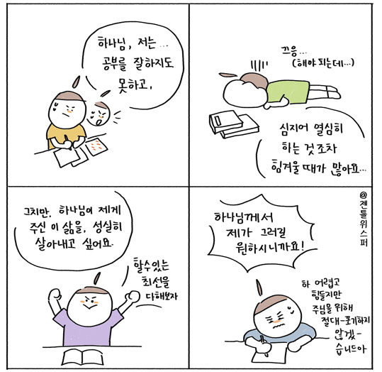 그래서 다시 게으름과 낙망을 회개하며 끊고, 일어서게 되는 거예요. 잘 안 되어도, 기도하며 최선을 다했어요.