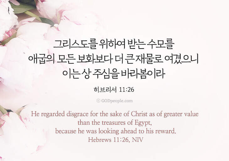 그리스도를 위하여 받는 수모를 애굽의 모든 보화보다 더 큰 재물로 여겼으니 이는 상 주심을 바라봄이라 – 히11:26 He regarded disgrace for the sake of Christ as of greater value than the treasures of Egypt, because he was looking ahead to his reward. – Hebrews 11:26, NIV ♥ 교도소 재소자에게 성경책을 보내드립니다. [플로잉전용상품] 재소자에게 성경책 보내기_우리말성경 단본(실버그린)우리말성경 단본 (무색인/무지퍼/페이퍼백/실버그린/DKV2406)두란노 편집부 [플로잉전용상품] 재소자에게 성경책 보내기_큰글로 읽는 우리말 비전성경 중단본(호박색)큰글로 읽는 우리말 비전성경 중단본(색인/무지퍼/PU/호박색/DKV2206)도서출판 두란노두란노 편집부 위 성경책을 구매 (플로잉 Flowing) 하시면 "프리즌 리바이벌 PRISON REVIVAL "을 통해서 국내 교정기관의 담장 안에서 지내시는 분들에게 전달됩니다.♥ 수용자 자녀에게 성경만화, 묵상365를 보내드립니다. [플로잉전용상품] 수용자 자녀에게 성경만화 보내기_만화 예수님의 생애 세트 (전3권)온 가족이 함께 보는 사복음서김동순 [플로잉전용상품] 수용자 자녀에게 성경만화 보내기_[개역개정판] 카툰성경 세트(완간/전3권)그린이 : 키이스 닐리, 데이비드 마일즈 [플로잉전용상품] 갓피플 통해 쌀 보내기_백미 (10kg)오픈스토리 [플로잉전용상품] 맛있는 반찬보내기_김치세트 (유기농백김치+겉절이)참식품주식회사 위 상품 구매 (플로잉 Flowing) 하시면 "세움"을 통해서 수용자(교도소 재소자) 자녀들에게 전달됩니다.+오늘의말씀으로 만들었어요♡ 오늘의말씀 아크릴 자석액자+말씀을 듣고 필사하세요♡ 개역개정 MP3 다운로드 | 태블릿으로 필사 | 종이노트로 필사 좋아요아멘개척교회 돕기 2021-12-17 · 2897 · 139 · 성경전도갓피플시편갓피플오늘의말씀말씀카드좋은성경구절히브리서11장26절_히11:26오늘의말씀더보기갓피플 오늘의말씀_에스겔36장36절갓피플 오늘의말씀_갈라디아서4장18절갓피플 오늘의말씀_누가복음6장23절