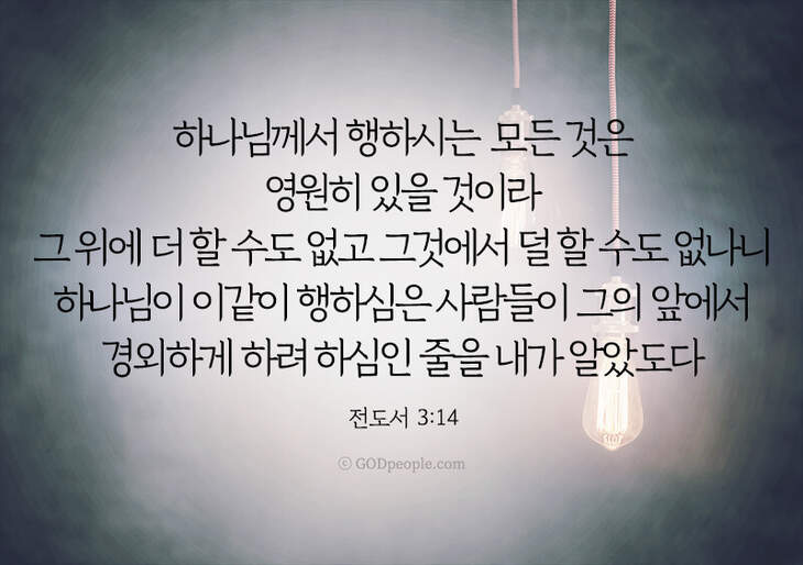 하나님께서 행하시는 모든 것은 영원히 있을 것이라 그 위에 더 할 수도 없고 그것에서 덜 할 수도 없나니 하나님이 이같이 행하심은 사람들이 그의 앞에서 경외하게 하려 하심인 줄을 내가 알았도다 – 전3:14