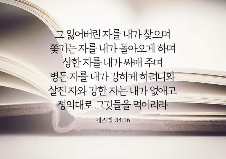 그 잃어버린 자를 내가 찾으며 쫓기는 자를 내가 돌아오게 하며 상한 자를 내가 싸매 주며 병든 자를 내가 강하게 하려니와 살진 자와 강한 자는 내가 없애고 정의대로 그것들을 먹이리라 – 겔34:16