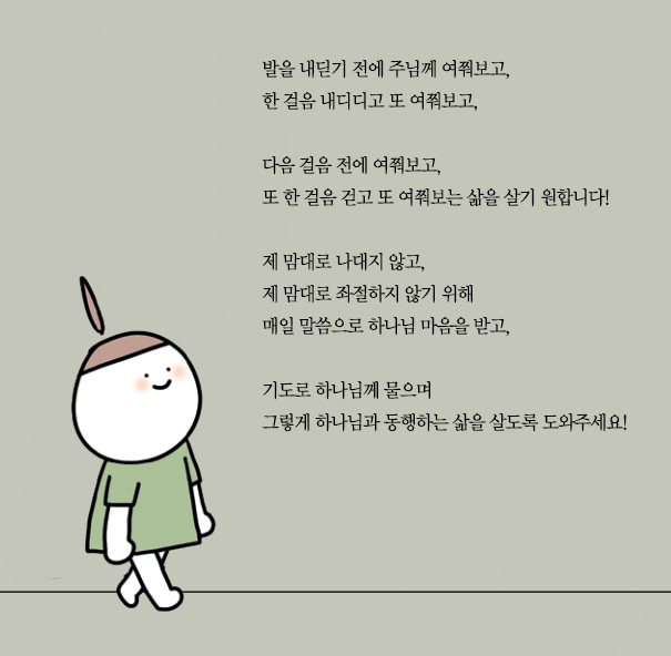 주님. 잘 안될 때, 스트레스를 받지 않게 하소서. 누구나 처음부터 잘하지 못함을 기억하고, 서투른 걸음마도 주님 손잡고, 기쁘게 할 수 있는 자원하는 마음을 부어주세요. 이 한걸음을 기도하며, 노력하며, 주님과 기쁘게 걷게 해주세요.