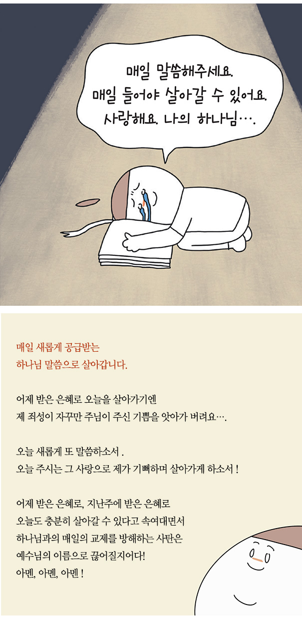 어제 받은 은혜로, 오늘을 살아갈 수 없습니다. 어제 밥 먹었다고, 오늘 안 먹는다면 점점 기운이 없어지겠지요. 성경말씀도 그렇습니다. 오늘 아무리 바빠도, 마음을 정해 성경을 충분히 읽으며 기도해보세요. 하나님과의 교제를 방해하는 마귀를 예수이름으로 끊고, 주님께 간구해보세요.