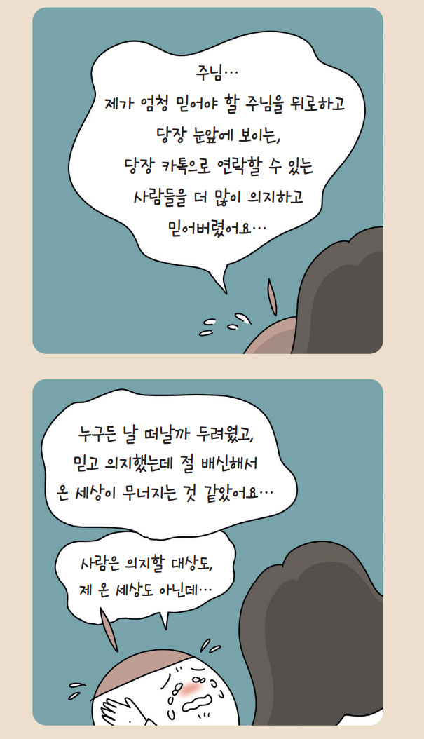 힘들고 속상하고 내편이 필요할 때, 제일 먼저 무슨 생각이 나시나요? 문자, 전화, 카톡… 사람들에게 다 이야기하면 시원할 것 같지만 항상 마음은 더 무거워져요. 그럴때 주님앞에 먼저 나아가 주님께 이야기 해보세요. 주님은 다 듣고 계십니다. 보이지 않아도 하나도 빼놓지 않고 당신의 이야기를 들어주시는 주님께 제일 먼저 달려가겠다고~ 약속!!해보세요