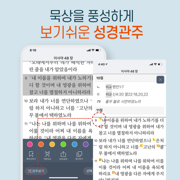 관련 구절까지 함께 볼 수 있는 관주/각주기능도 있어요