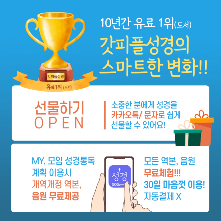 많은 분들의 요청이 있었던 선물하기와 모든 역본음원 30일 무료체험이 오픈 되었습니다. 이를 위해 개역개정이 포함된 유료 버전에서 무료 설치 후 구매 할 수 있도록 업그레이드 되었습니다.