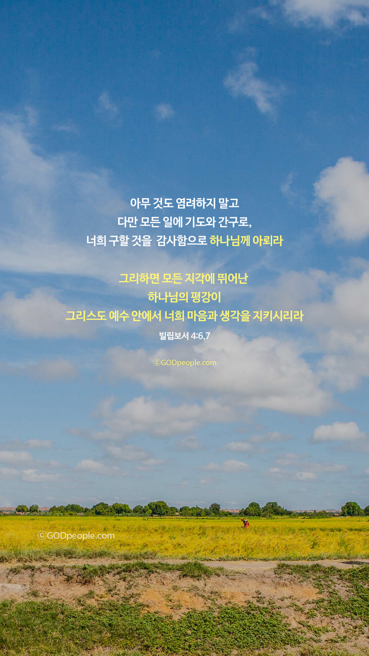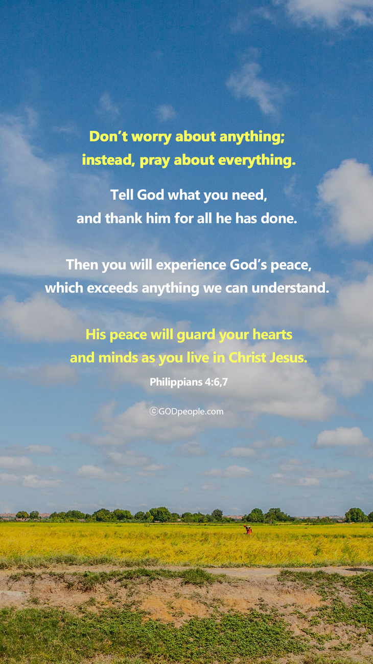 아무 것도 염려하지 말고 다만 모든 일에 기도와 간구로, 너희 구할 것을 감사함으로 하나님께 아뢰라 그리하면 모든 지각에 뛰어난 하나님의 평강이 그리스도 예수 안에서 너희 마음과 생각을 지키시리라 - 빌립보서 4:6,7