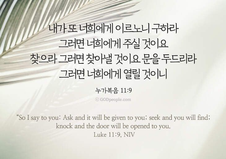 내가 또 너희에게 이르노니 구하라 그러면 너희에게 주실 것이요 찾으라 그러면 찾아낼 것이요 문을 두드리라 그러면 너희에게 열릴 것이니 – 눅11:9 "So I say to you: Ask and it will be given to you; seek and you will find; knock and the door will be opened to you. – Luke 11:9, NIV 좋아요아멘개척교회 돕기 2022-06-23 · 723 · 7 · 1성경전도갓피플갓피플오늘의말씀말씀카드좋은성경구절누가복음11장9절누가복음_눅11:9임시더보기[점검] 당신의 믿음을 점검 하라- 박한수목사초청 필그림교회 2022 사순절 특별 집회겁쟁이 사역자 파라과이에 우뚝 서다 - 임동수 선교사ㅣ갓뷰 전능적 주님시점태어나서 처음으로 돈 달라는 기도를 했다 | 갓피플스토리