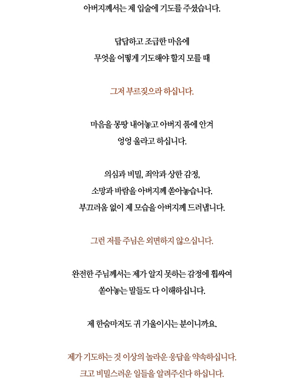 무엇을 어떻게 기도해야 할지 모를 때 그저 주님의 이름만 불러도 저의 기도를 외면하지 않으시는 주님 감사합니다. 저의 한숨소리조차 귀담아 들으시는 주님이 계시기에 힘을 얻습니다. 날마다 주님께 나아가 부르짖게 하소서.