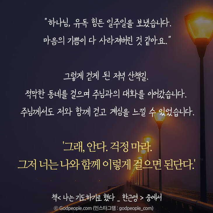 그저 이런 고백을 하며 아무도 없는 거리를 걷는 동안, 주님께서도 저와 함께 걷고 계심을 느낄 수 있었습니다. 주님께서 제 마음에 대고 이렇게 속삭이셨기 때문입니다.