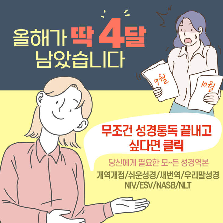 올해가 4달 남았습니다. 아..이제 본격적으로 성경통독을 끝낼 때가 되었는데 자신 없다구요? 걱정마세요. 갓피플성경이 당신의 성경통독 끝내기를 팍팍팍! 도와드리겠습니다.